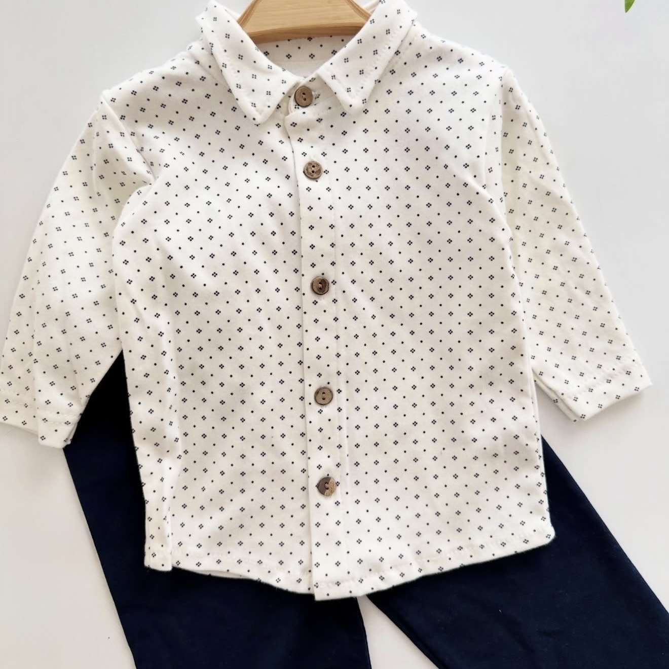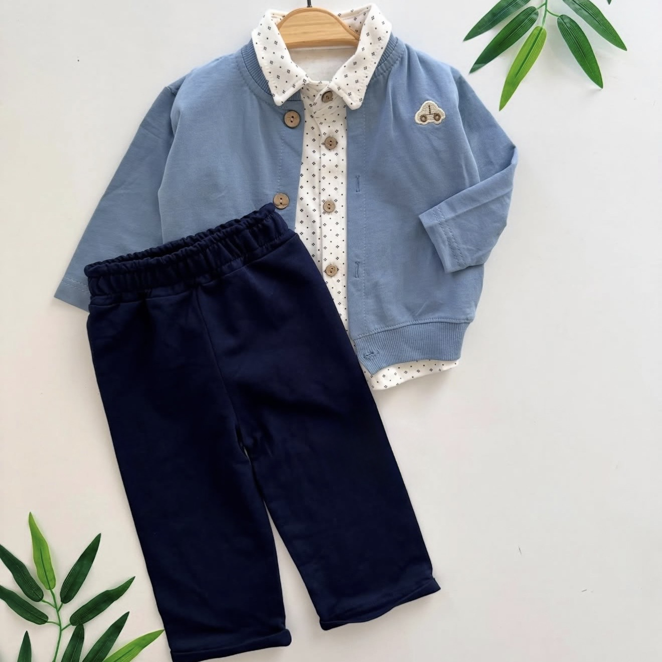 Set elegant pentru bebeluși, realizat din materiale moi și confortabile, ideal pentru pielea sensibilă. Setul este compus din cămașă tip body cu guler, cardigan cu nasturi și pantaloni asortați, într-o combinație rafinată de nuanțe bleu, alb și bleumarin.