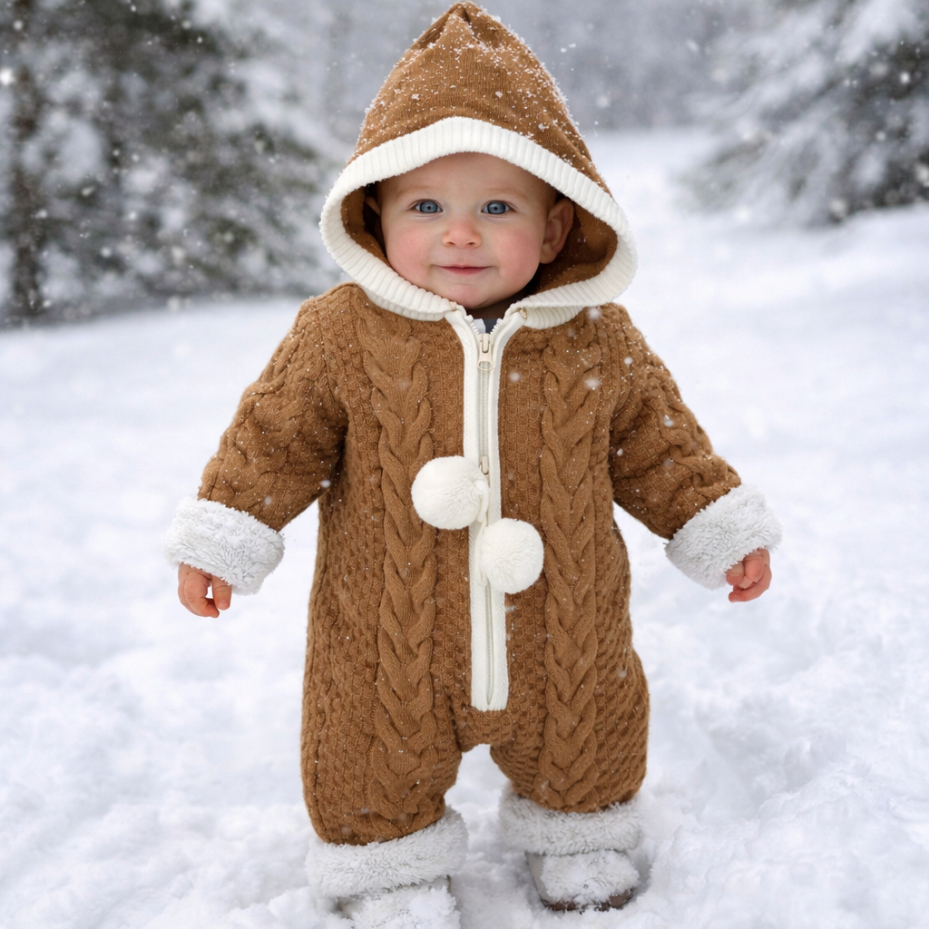 Combinezon tricotat de iarnă pentru bebeluși, căptușit și foarte călduros, ideal pentru plimbări în zăpadă. Design elegant, confort maxim și detalii adorabile 🤍