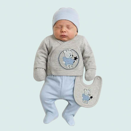 Realizat din bumbac moale, fin la atingere, acest set cuprinde tot ce are nevoie un bebeluș: