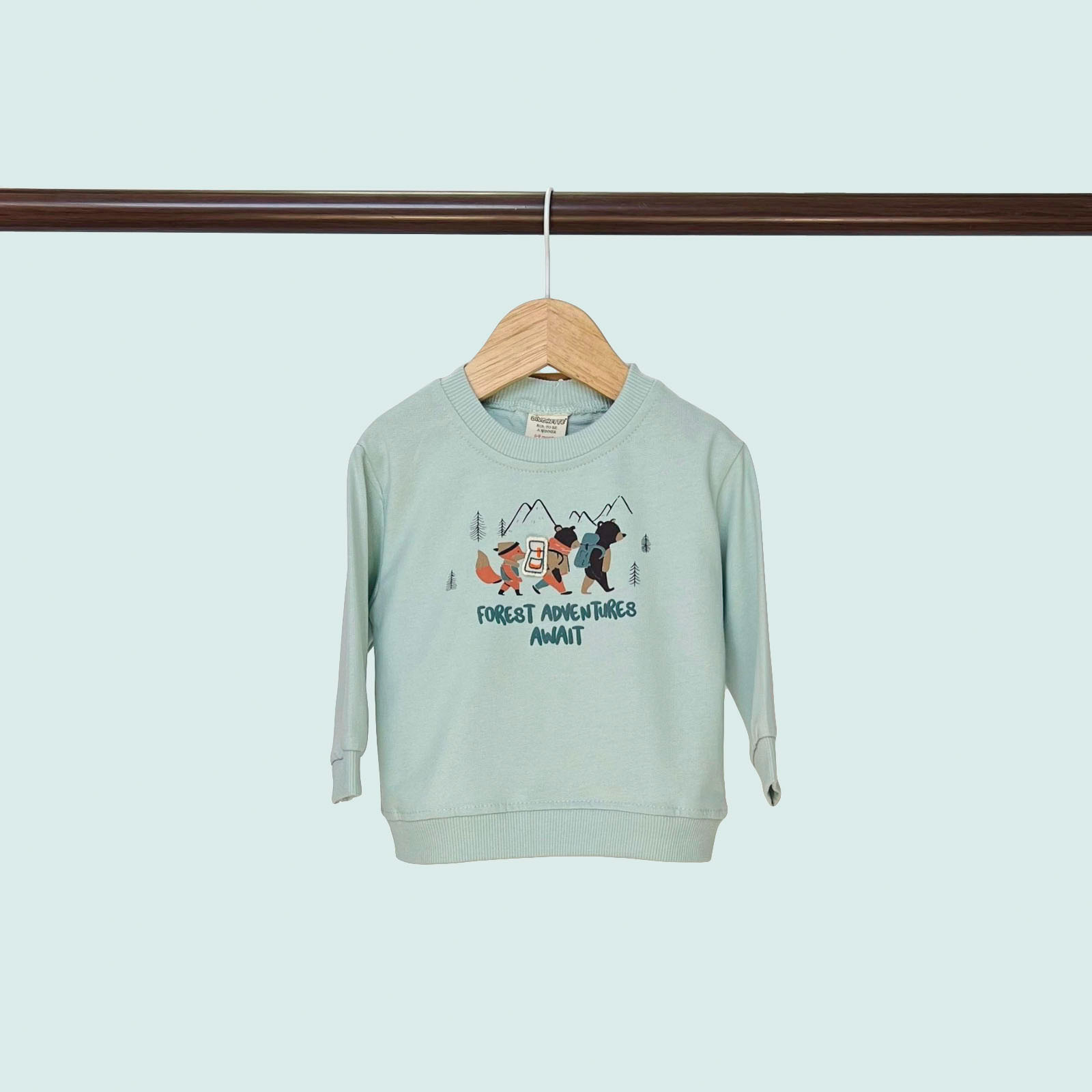 Cu un design adorabil, bluzița este decorată cu imprimeu tematic – animăluțe prietenoase pregătite de drumeție prin pădure, sub mesajul inspirațional „Forest Adventures Await”. Detaliile fine și nuanța delicată de verde mentă pastel adaugă rafinament și un aer vesel, transformând această piesă vestimentară într-un must-have pentru garderoba de sezon.