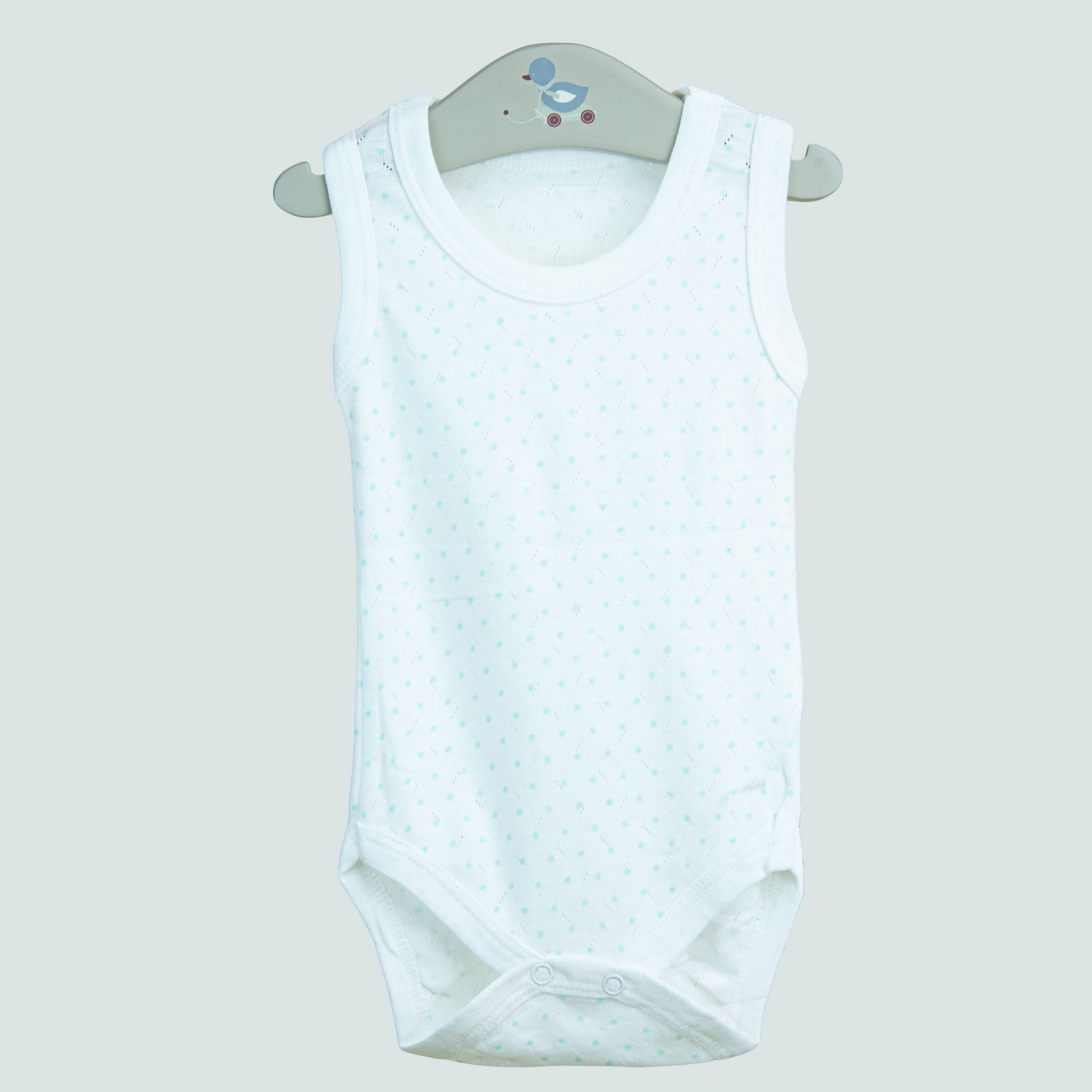 Body bebeluș fără mâneci – alb cu buline fine turcoaz