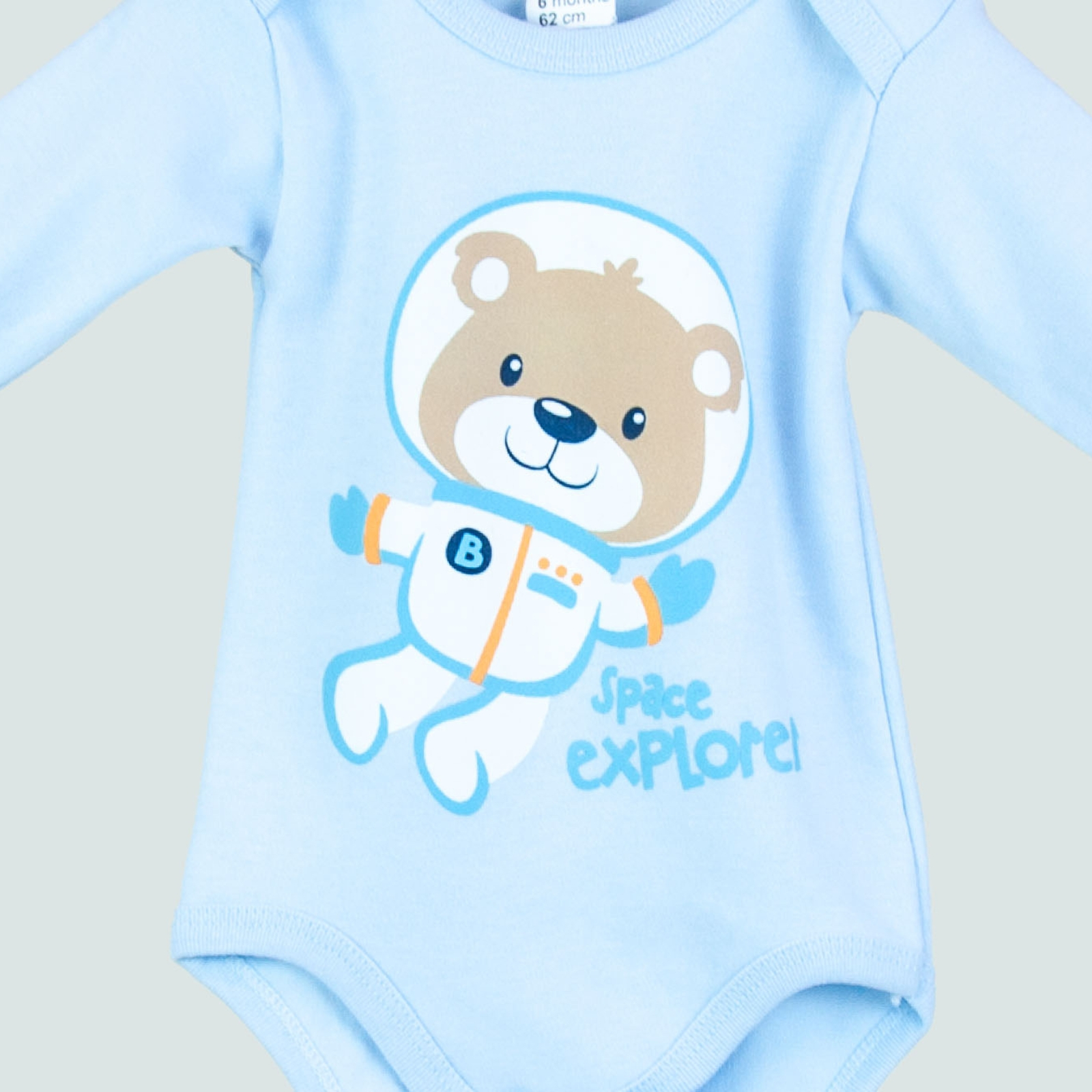 Pe fundal bleu deschis, imprimeul îl prezintă pe un ursuleț zâmbitor în costum de cosmonaut, însoțit de textul „Space Explorer” – o alegere perfectă pentru micii visători care visează la stele chiar din pătuțul lor. Este o piesă care combină drăgălășenia cu imaginația.