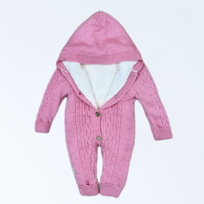 Combinezon tricotat de iarnă pentru bebeluși, cu glugă și interior căptușit pufos. Călduros, confortabil și elegant.