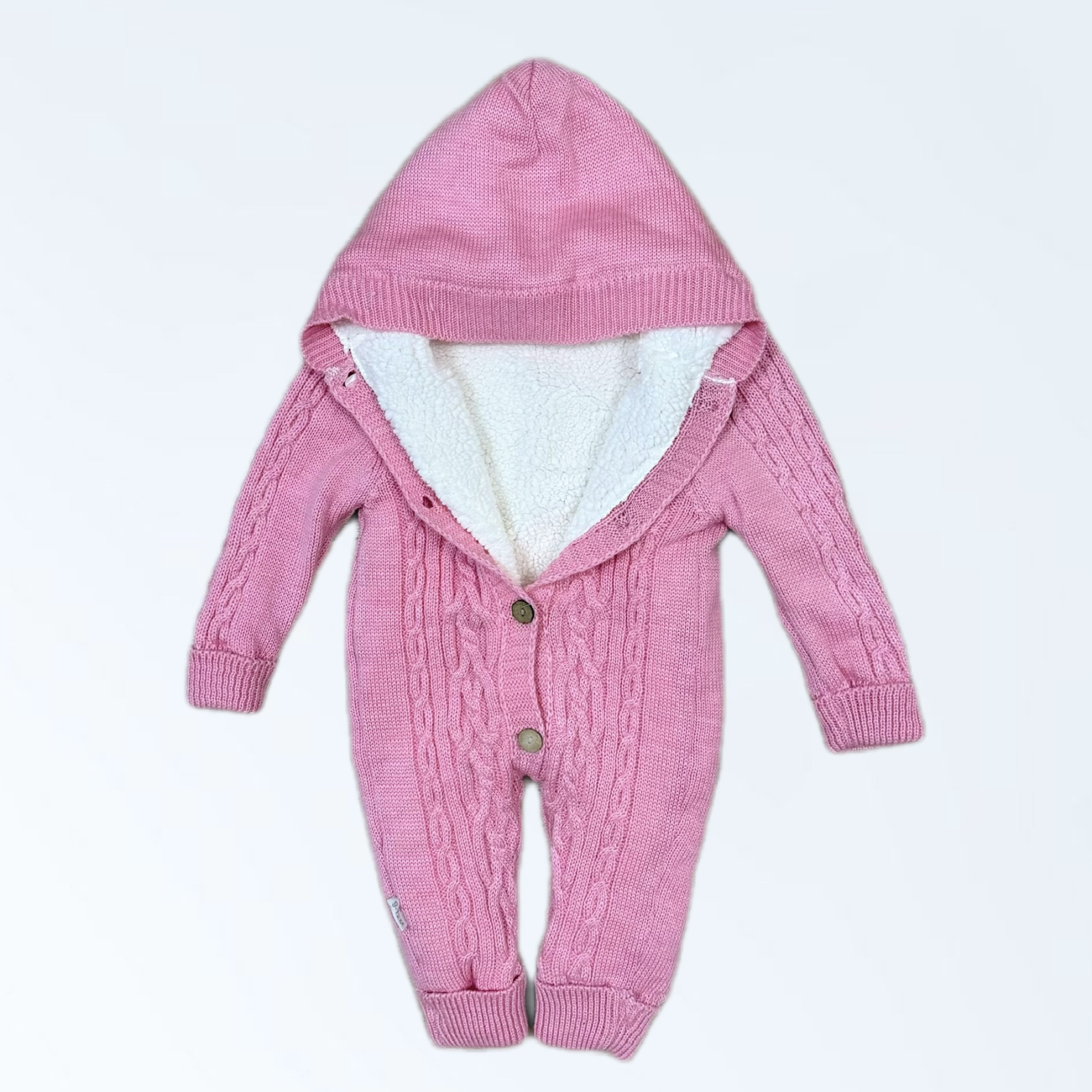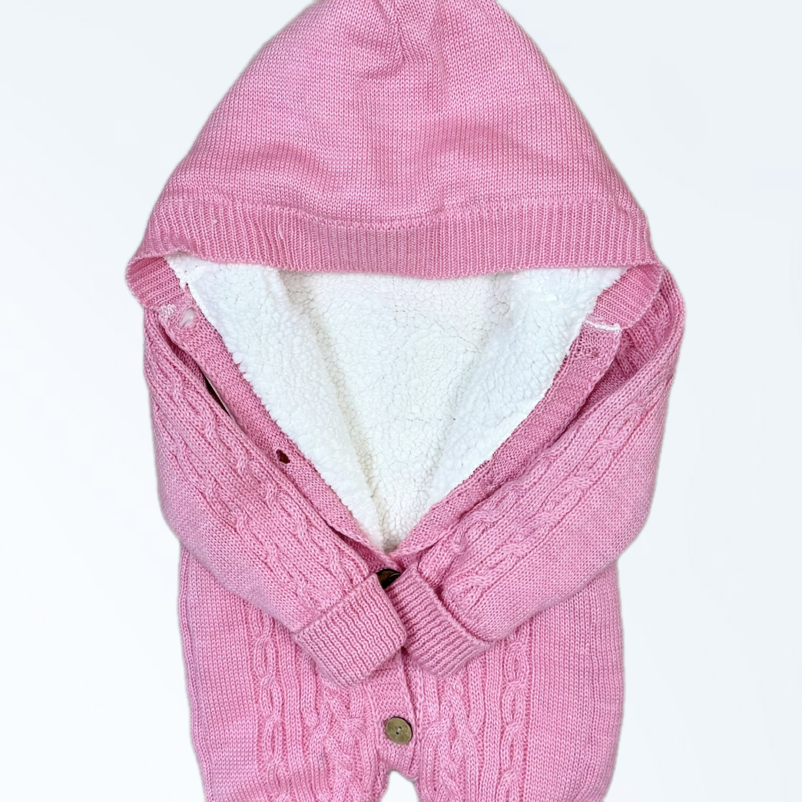 Combinezon tricotat pentru bebeluși, ideal pentru sezonul rece, realizat din material moale și plăcut la atingere. Interiorul este căptușit cu material pufos, oferind protecție termică și confort sporit în zilele răcoroase. Modelul cu torsade delicate și glugă integrată adaugă un plus de stil, fiind potrivit atât pentru plimbări, cât și pentru ocazii speciale. Se închide frontal cu nasturi, pentru îmbrăcare ușoară și rapidă. O alegere practică și elegantă pentru garderoba de iarnă a bebelușului sau pentru un cadou inspirat.