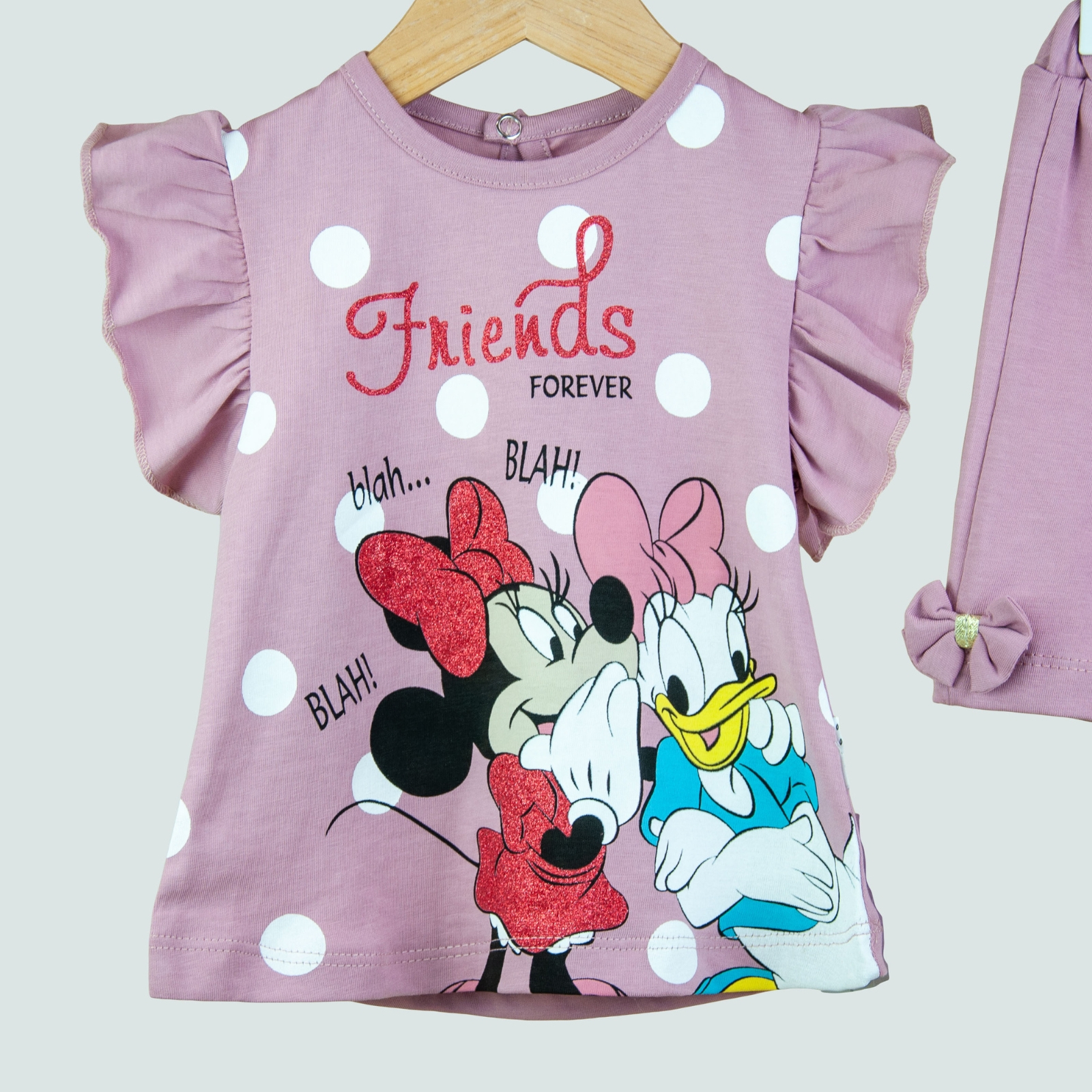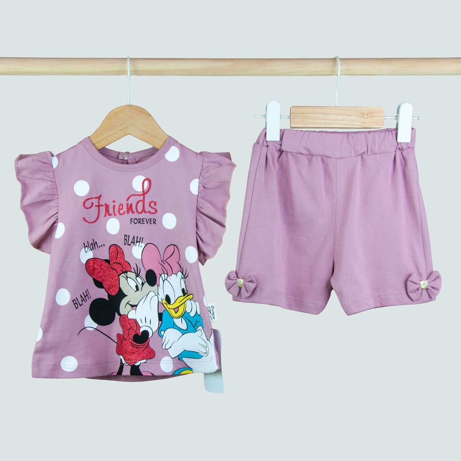🎀 Set fetiță 2 piese – tricou cu Minnie & Daisy și pantaloni scurți cu fundițe 💜