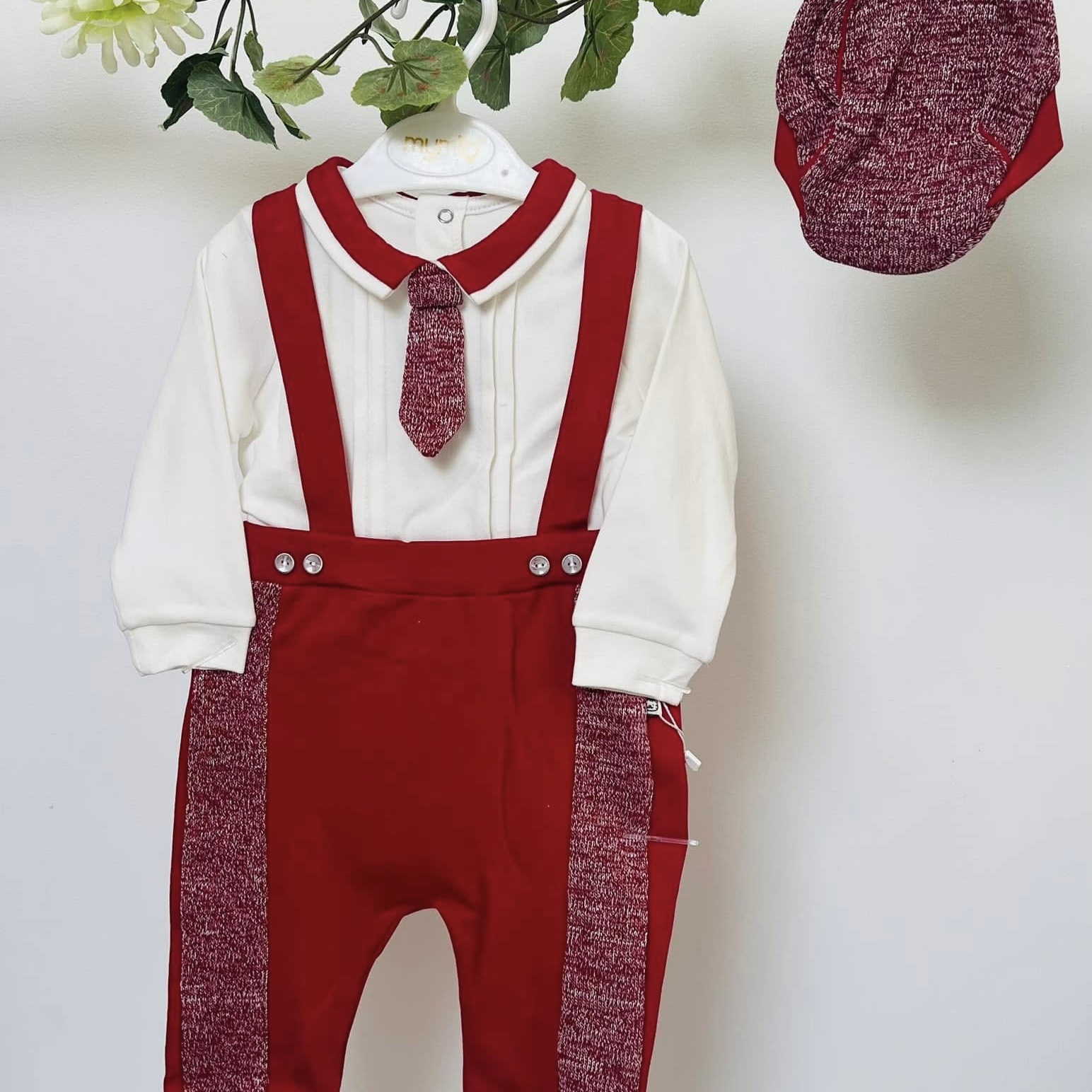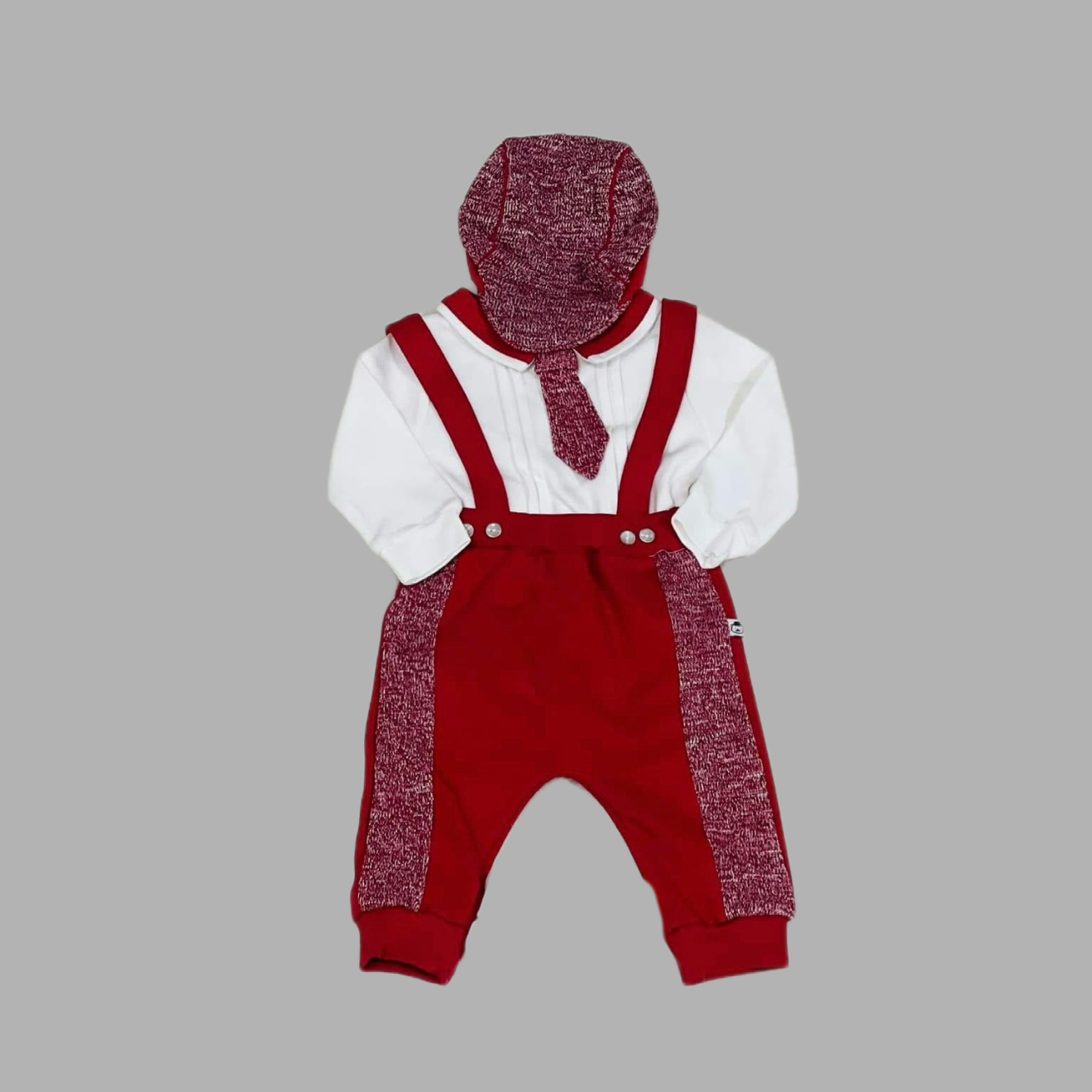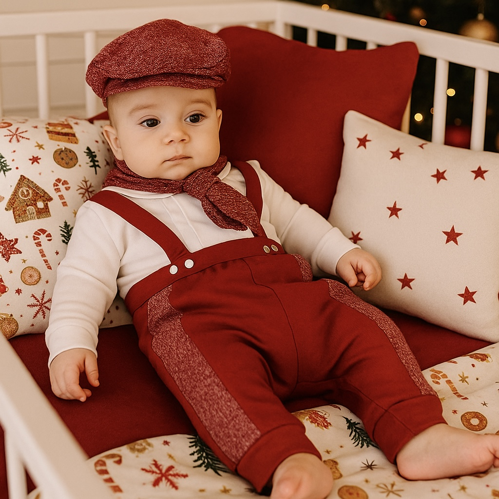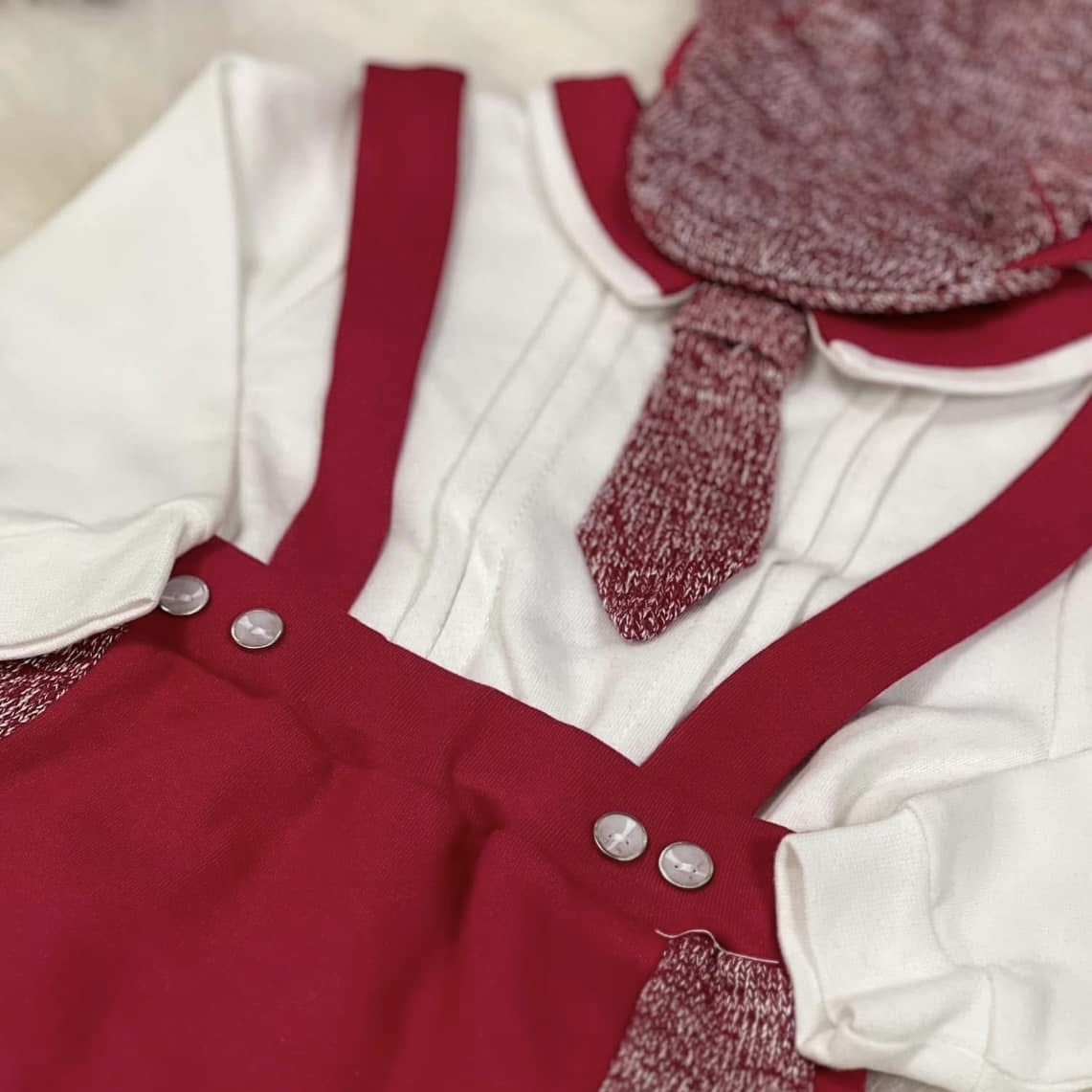 Set elegant de Crăciun pentru băieței, format din body alb cu cravată fixă, pantaloni cu bretele și bască asortată. Realizat din materiale moi și confortabile, ideal pentru ședințe foto, botez sau petreceri festive. Culoare roșu burgund cu accente rafinate, perfect pentru primele sărbători ale micuțului.