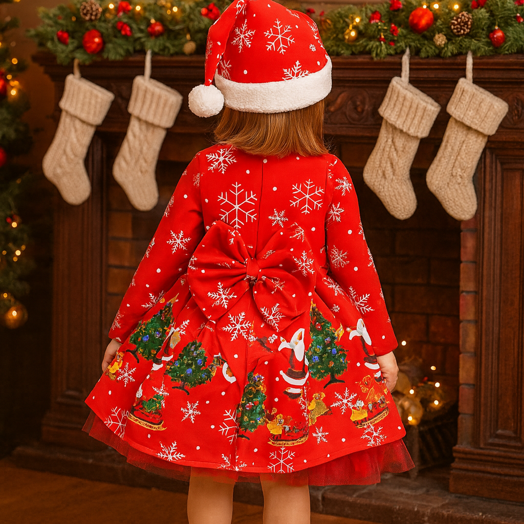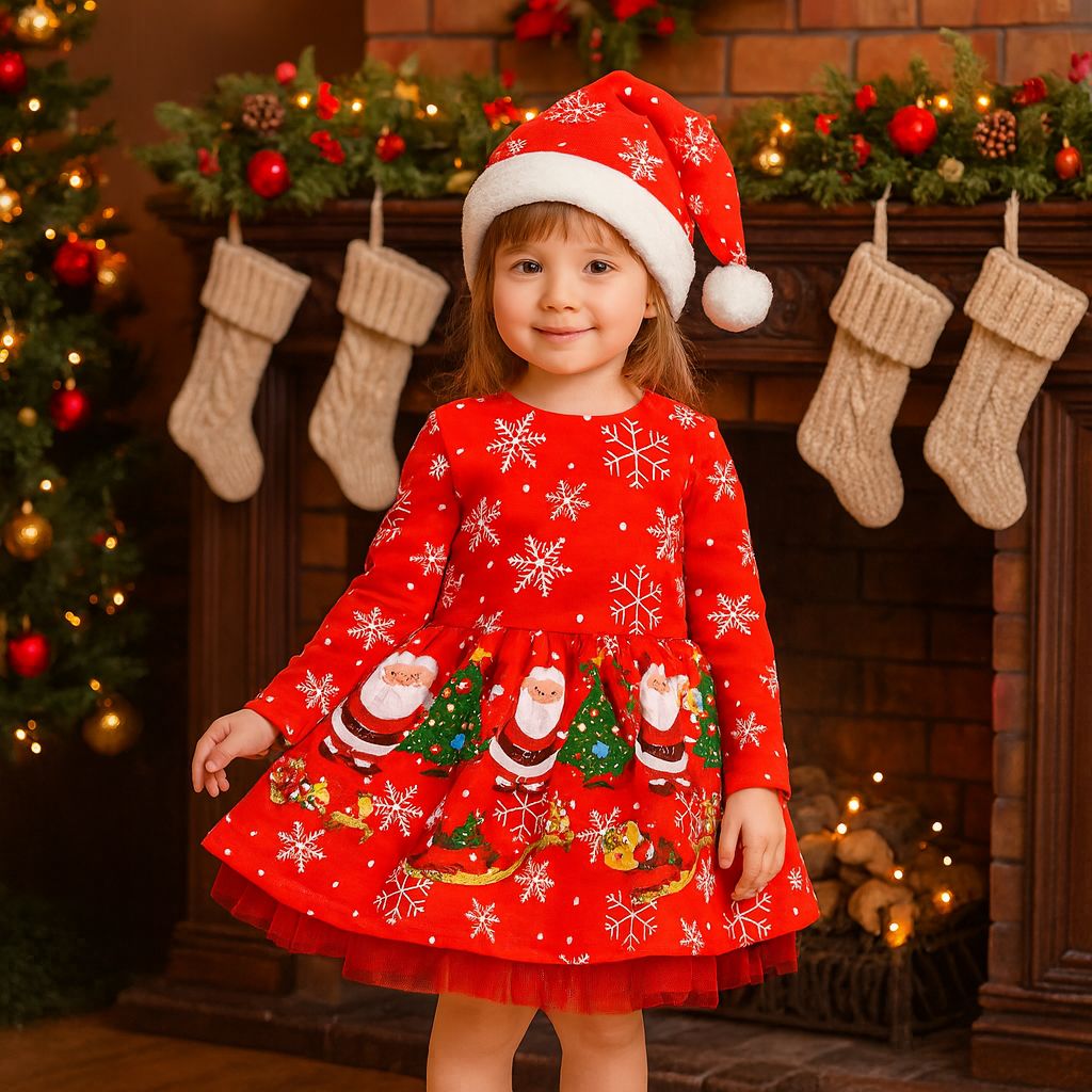 Rochiță festivă cu Moș Crăciun & fustiță cu tulle, completată de căciulița pufoasă. Perfectă pentru poze, evenimente și cadouri de sărbători!