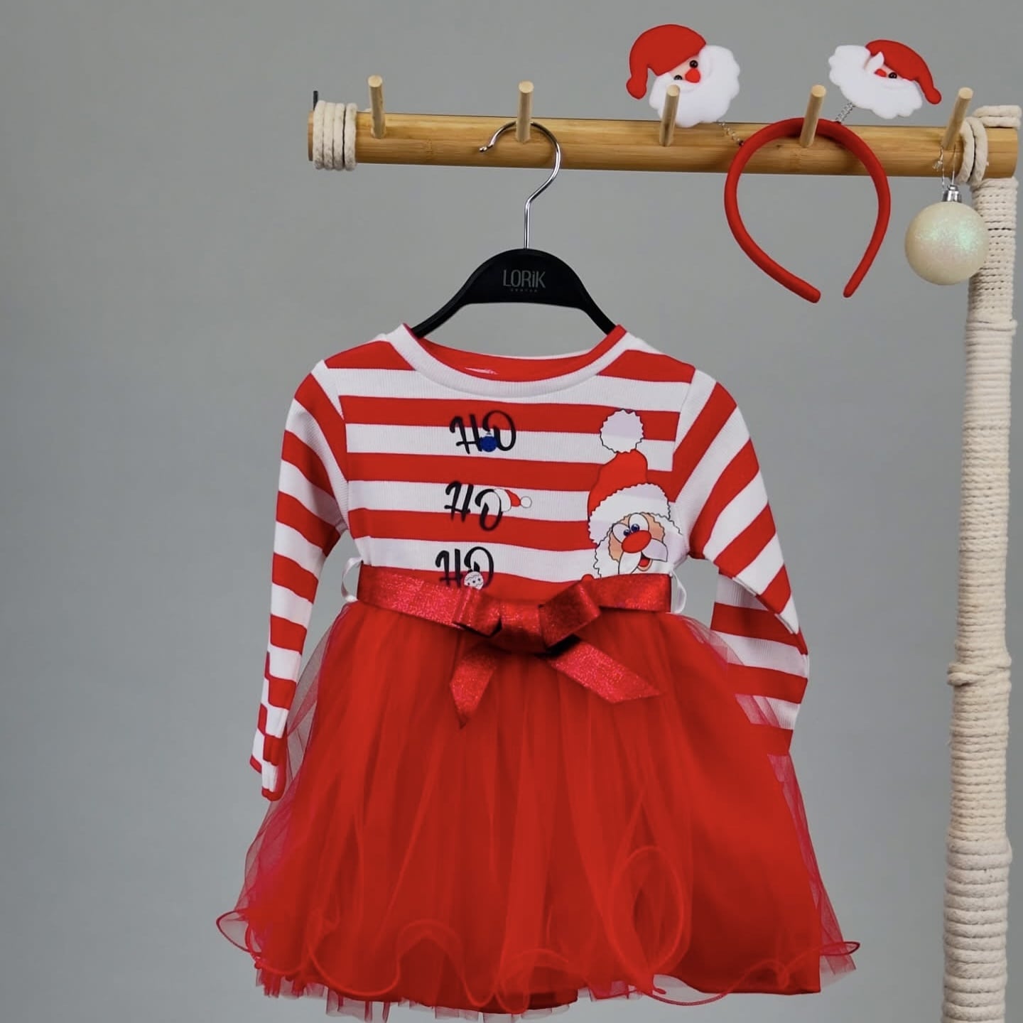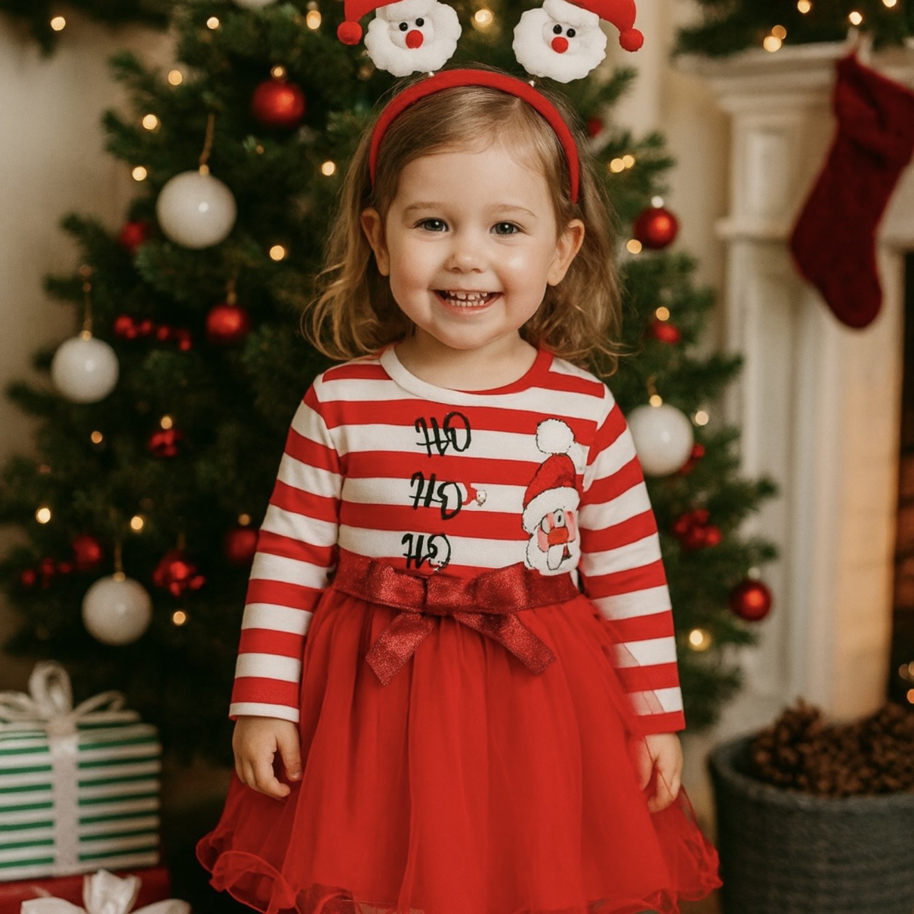 Rochiță de Crăciun cu dungi și tulle roșu, super confortabilă și festivă, însoțită de cordeluță cu moși. Perfectă pentru poze, serbări și atmosfera magică a sărbătorilor!