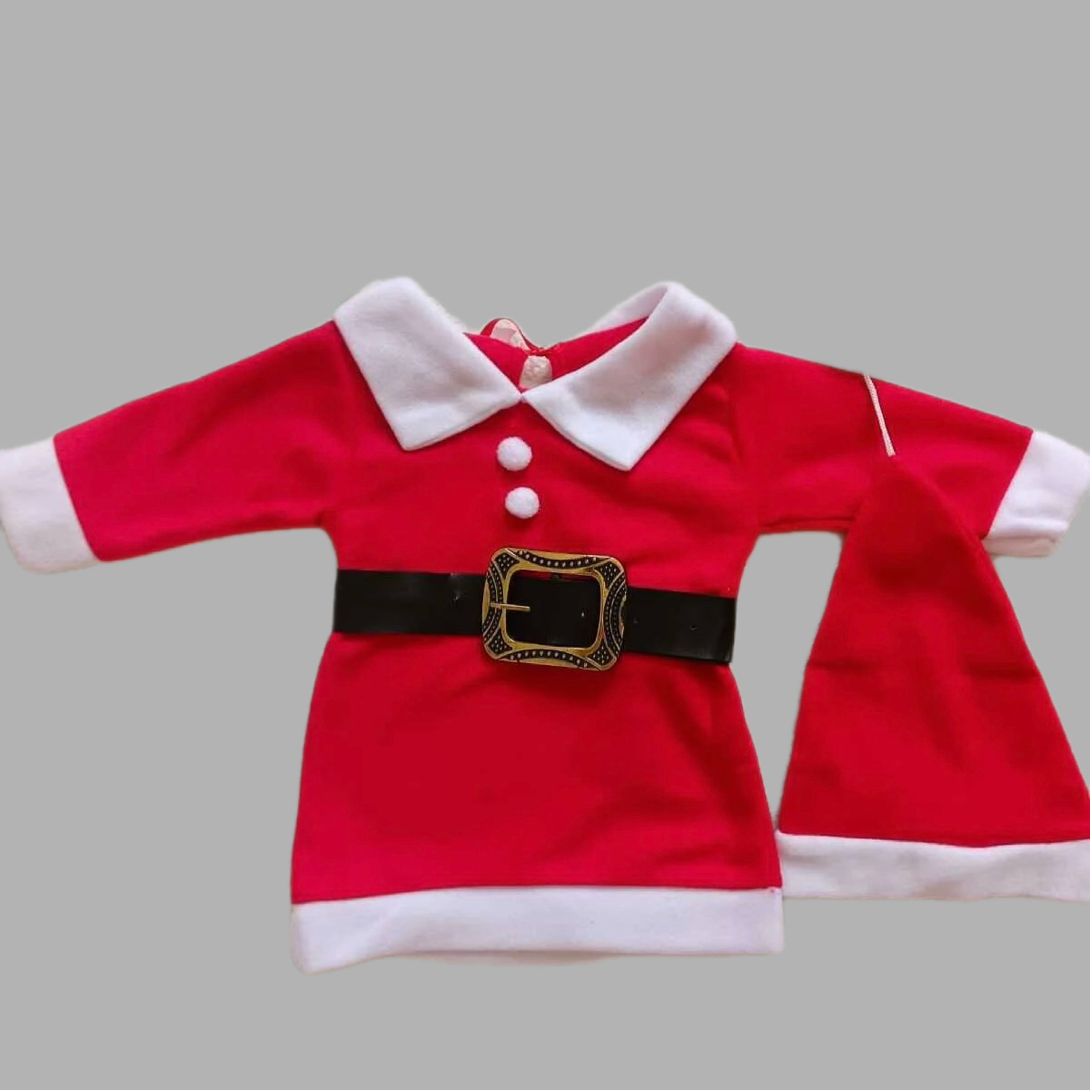 Set adorabil de Crăciuniță pentru fetițe, realizat din material moale și plăcut la atingere. Rochiță roșie cu detalii albe și centură decorativă, completată de căciuliță asortată — perfectă pentru poze și sărbători pline de magie.