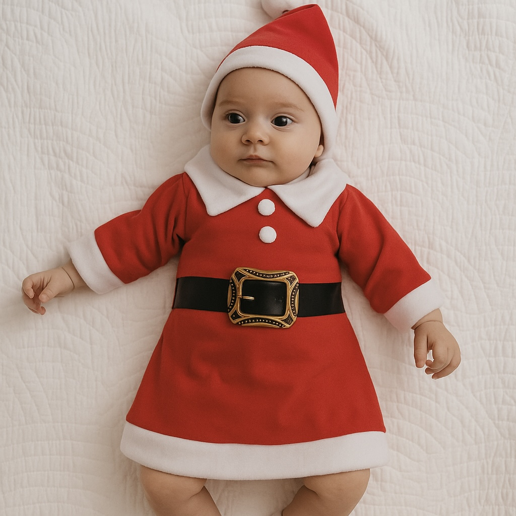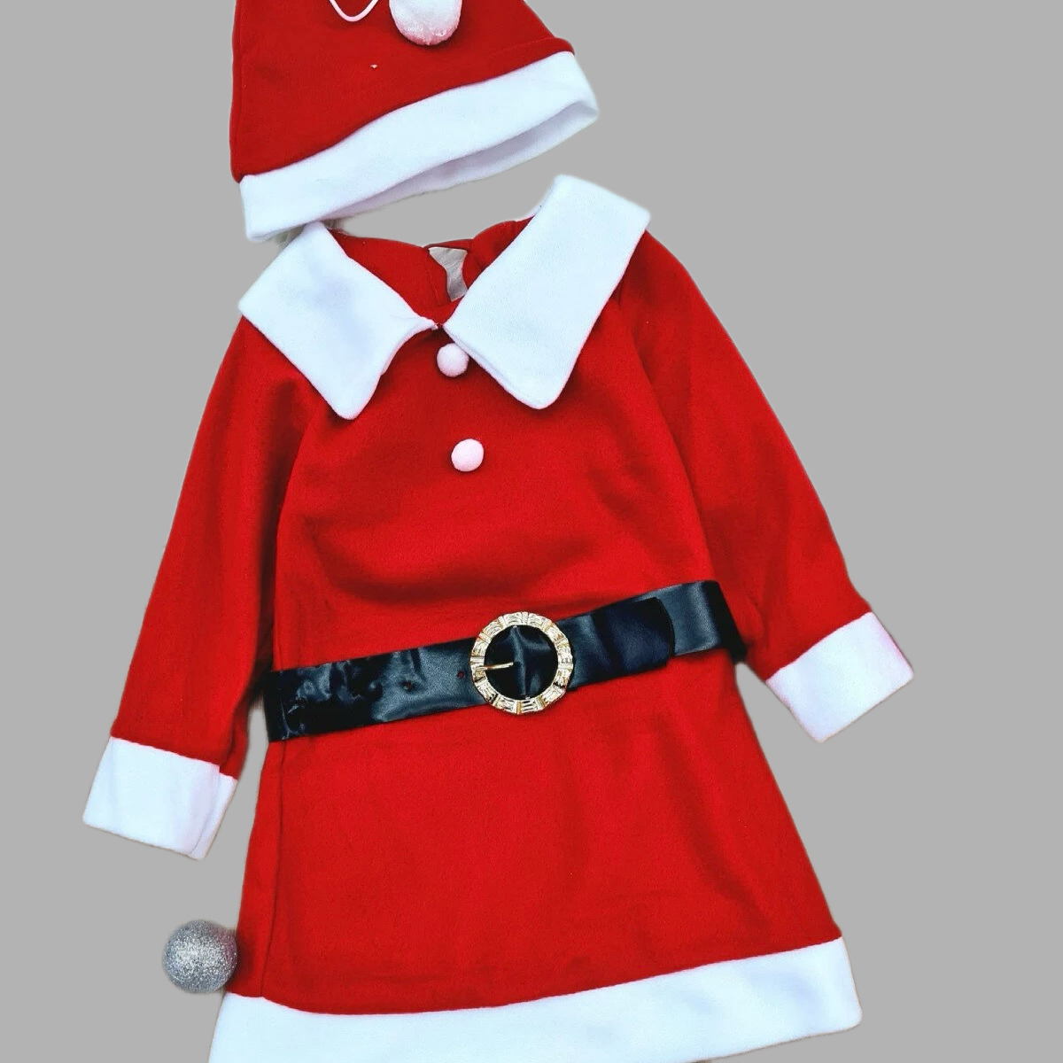 Rochița roșie este decorată cu guler alb contrastant, nasturi pufoși și o centură aplicată cu detaliu auriu — detalii care îi oferă un aspect autentic de mini Crăciuniță. Căciulița asortată completează ținuta, fiind elastică și confortabilă pentru capul fetiței.