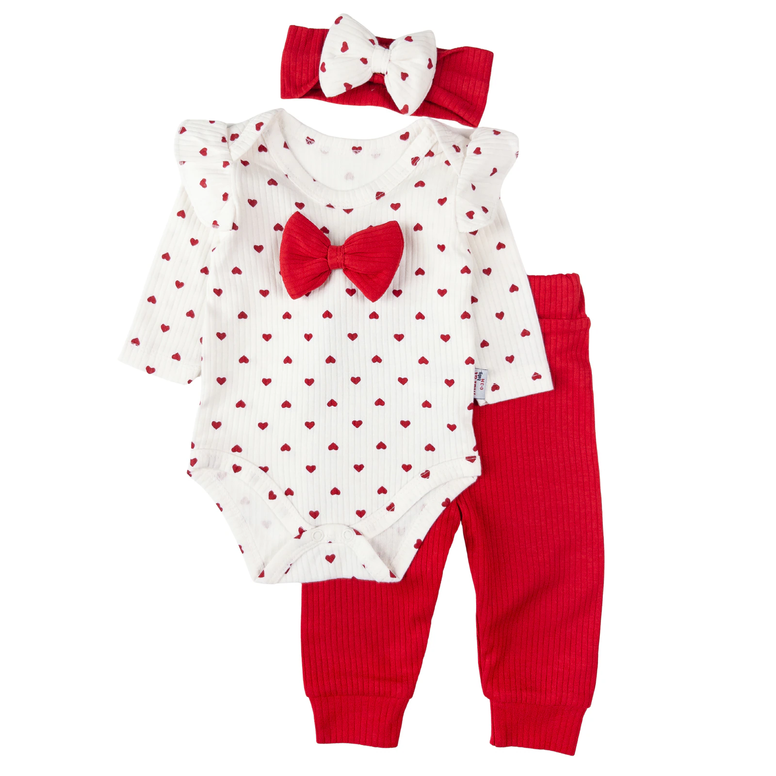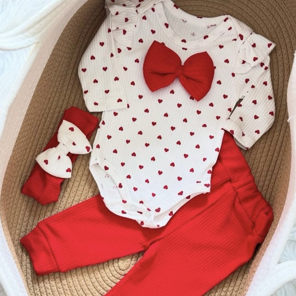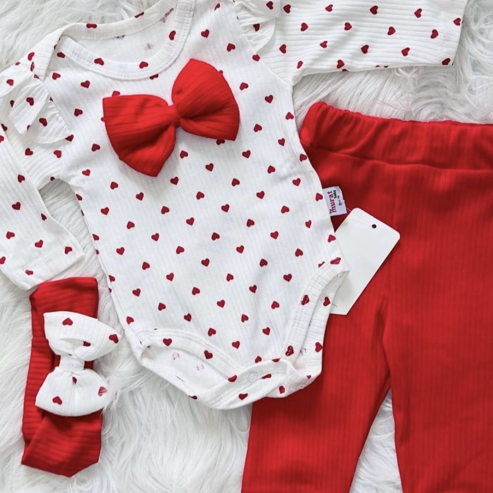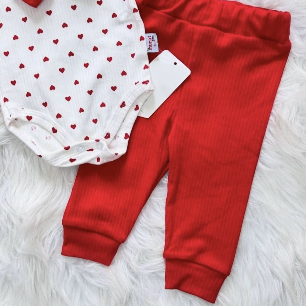 Set pentru bebeluși realizat din material moale, striat, delicat cu pielea sensibilă, creat pentru confort și libertate de mișcare. Setul este compus din body cu mânecă lungă, pantaloni asortați și bentiță, toate într-o combinație elegantă de alb și roșu, cu imprimeu discret cu inimioare.
