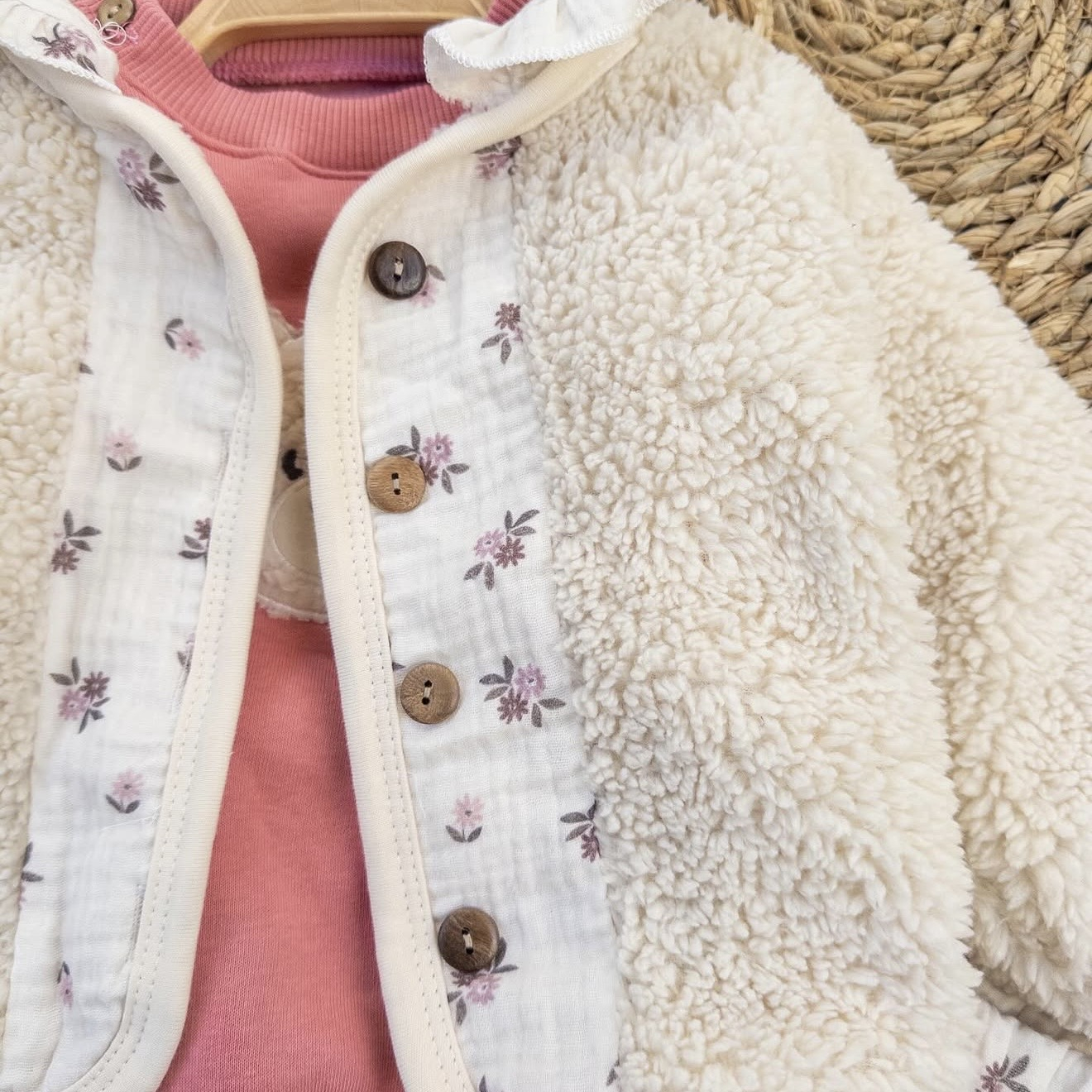 • Geacă Teddy Moale și Pufoasă: Piesa vedetă a setului, o jachetă din material tip "teddy bear" în nuanța crem, incredibil de moale și călduroasă. Panourile interioare și bordurile cu imprimeu floral delicat adaugă o notă chic și unică.
