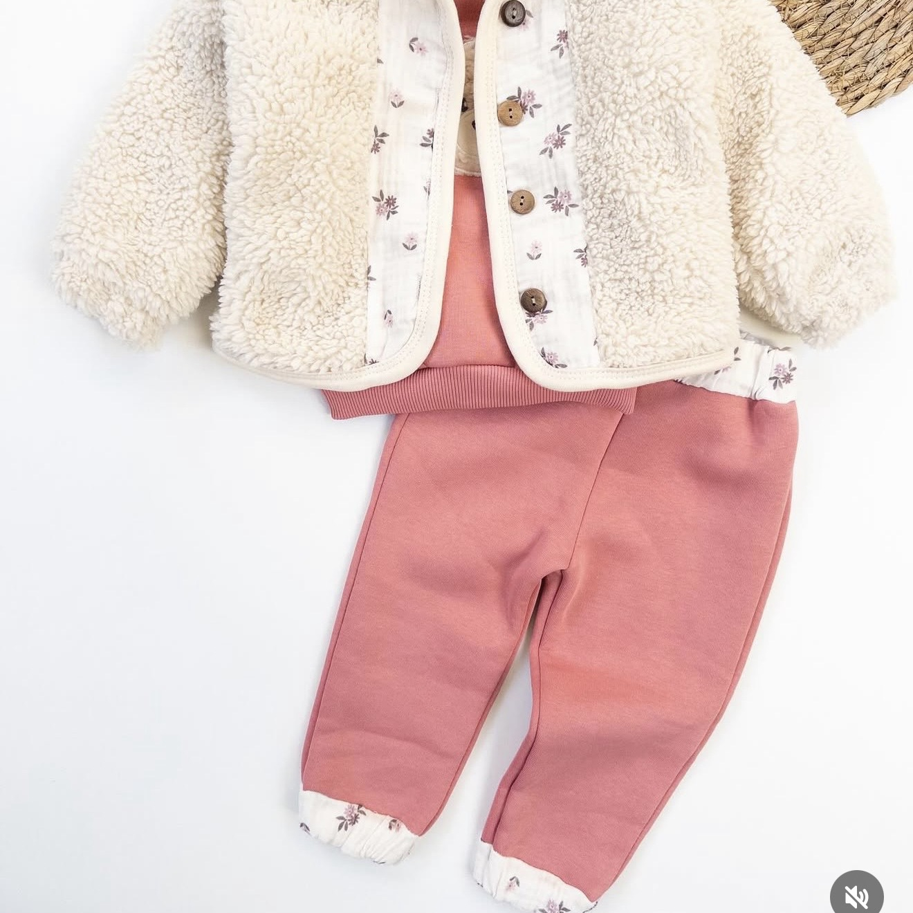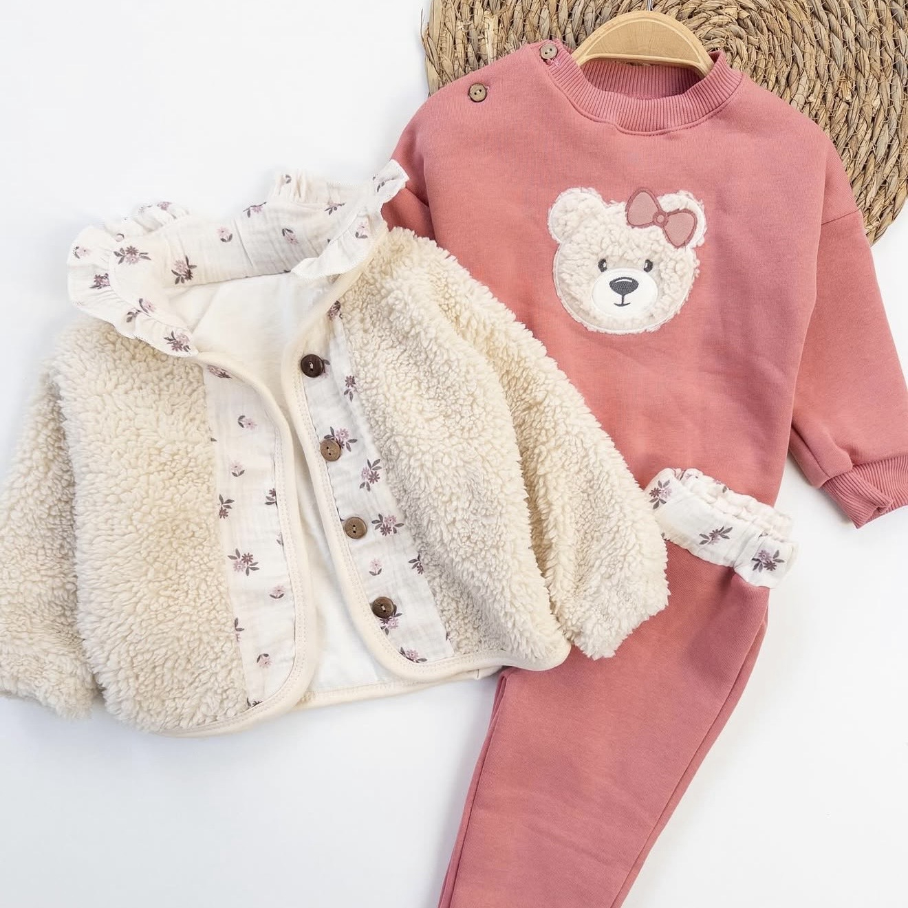 Set adorabil din 3 piese: Jachetă Teddy moale și pufoasă în crem, alături de compleul călduros Dusty Rose. Confort maxim și stil jucăuș pentru zilele răcoroase!