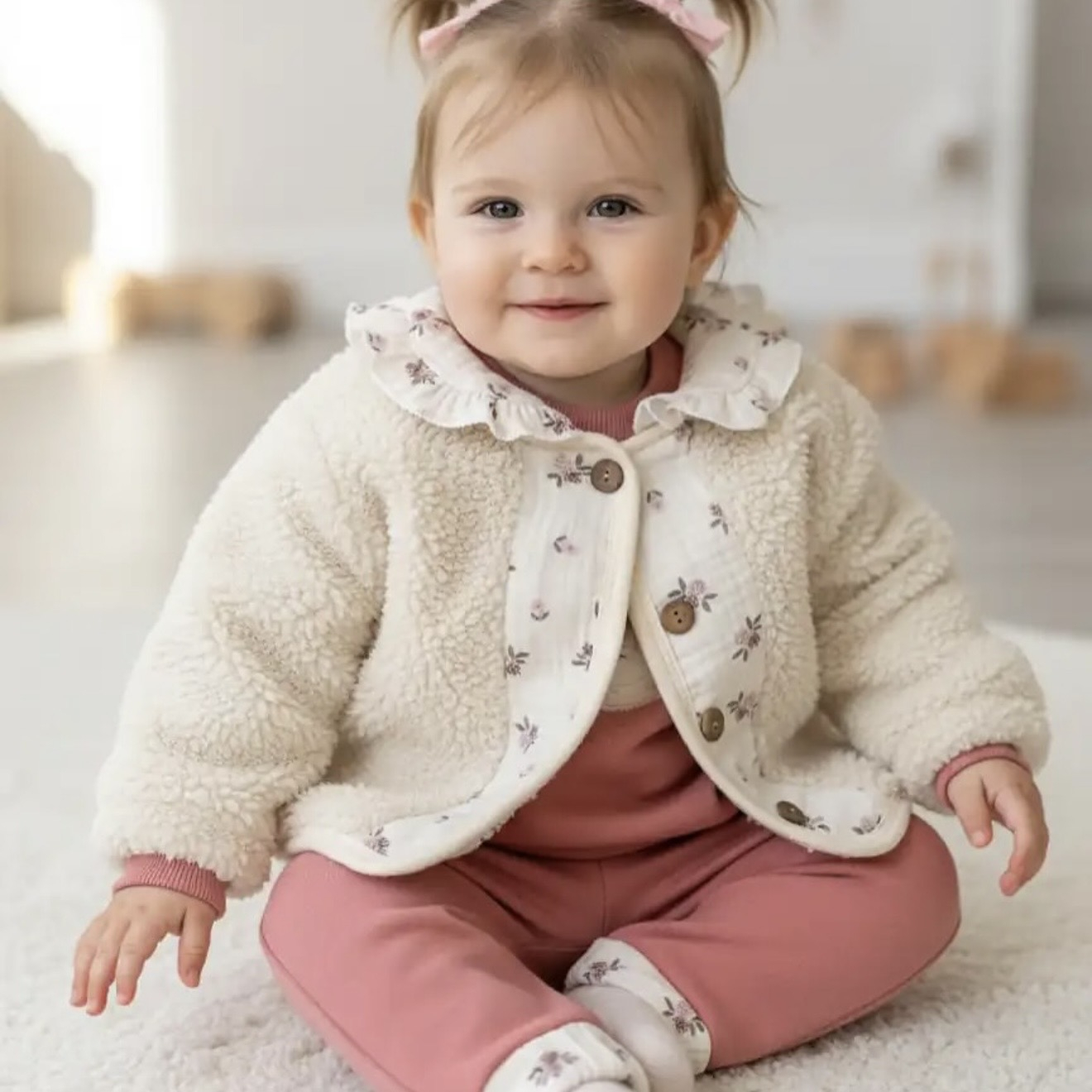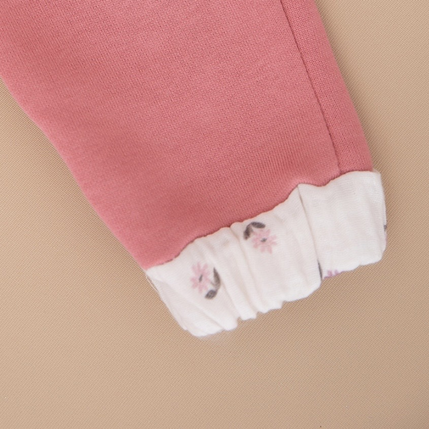 • Compleu din Bumbac Delicat: Sub jachetă, se ascunde un compleu adorabil din 2 piese în nuanța caldă de Dusty Rose (roz prăfuit). Materialul moale, tip french terry sau bumbac gros, este perfect pentru pielea sensibilă a bebelușilor.