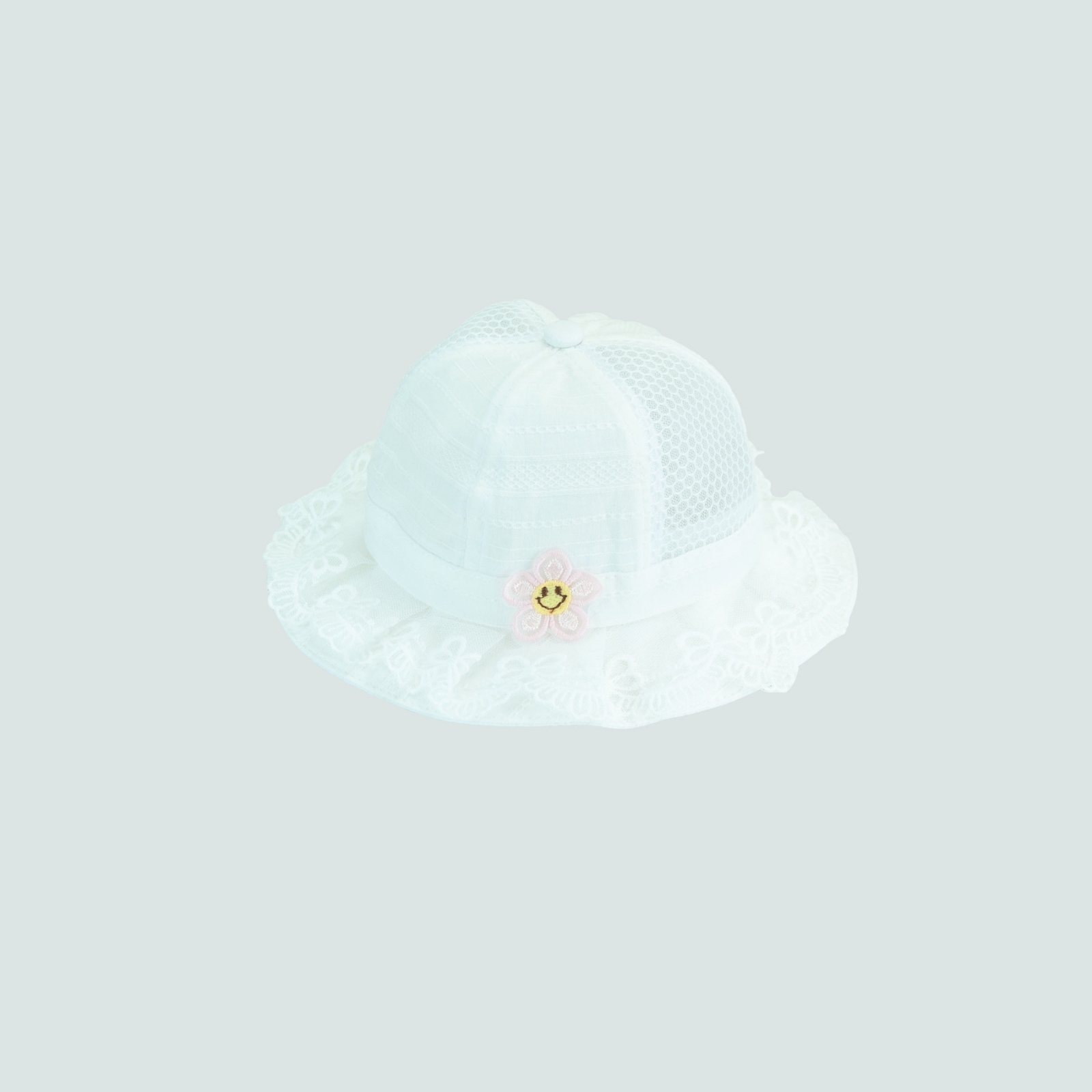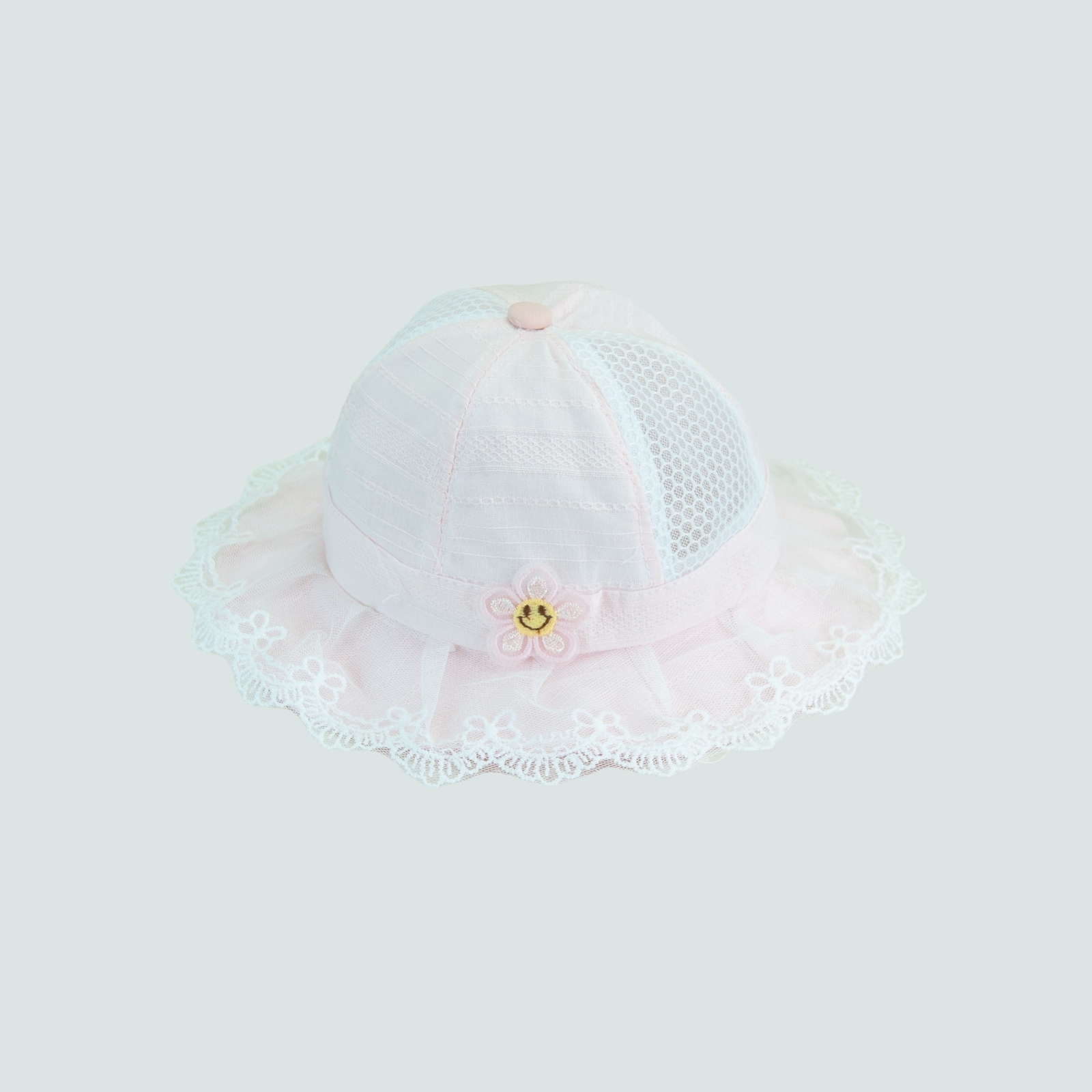 Această pălăriuță adorabilă este alegerea perfectă pentru zilele însorite! Cu un design fin, în nuanță pastel de roz și bordură din dantelă brodată, aduce un plus de eleganță fiecărei ținute de vară. Floarea zâmbitoare aplicată delicat adaugă un strop de veselie și farmec.