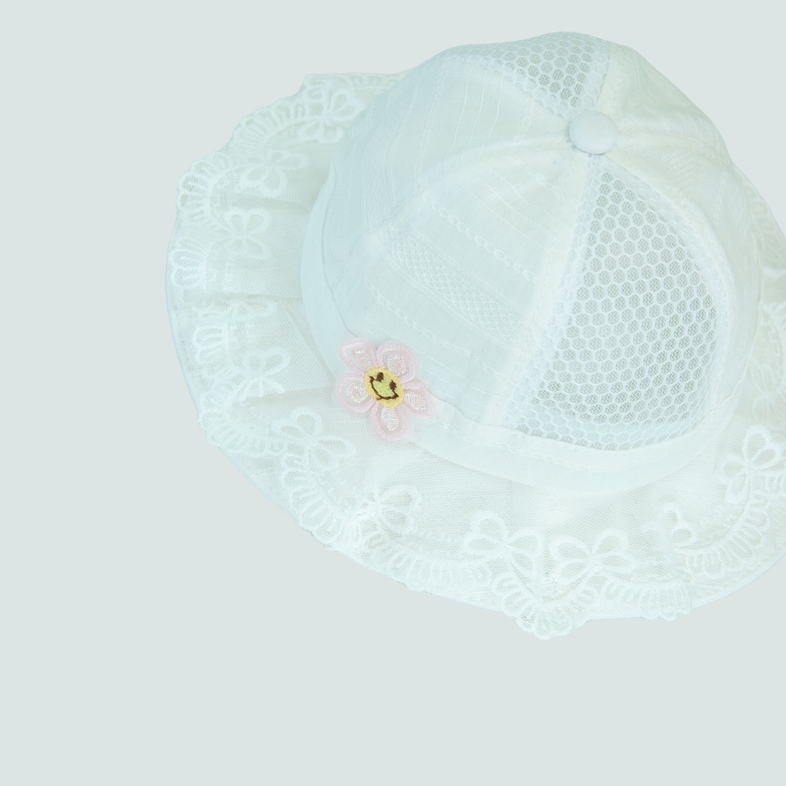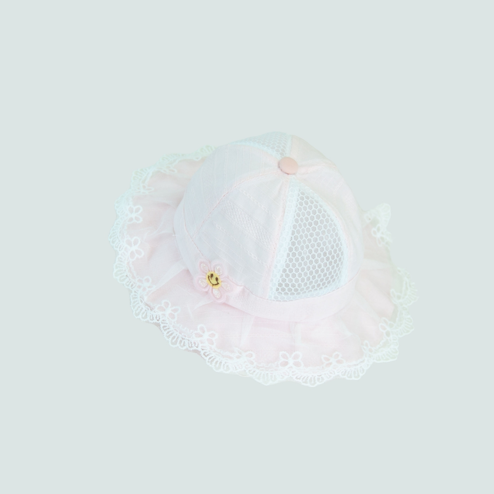 🌸 Pălăriuță roz cu dantelă și floare zâmbitoare – eleganță și protecție pentru micile domnișoare ☀