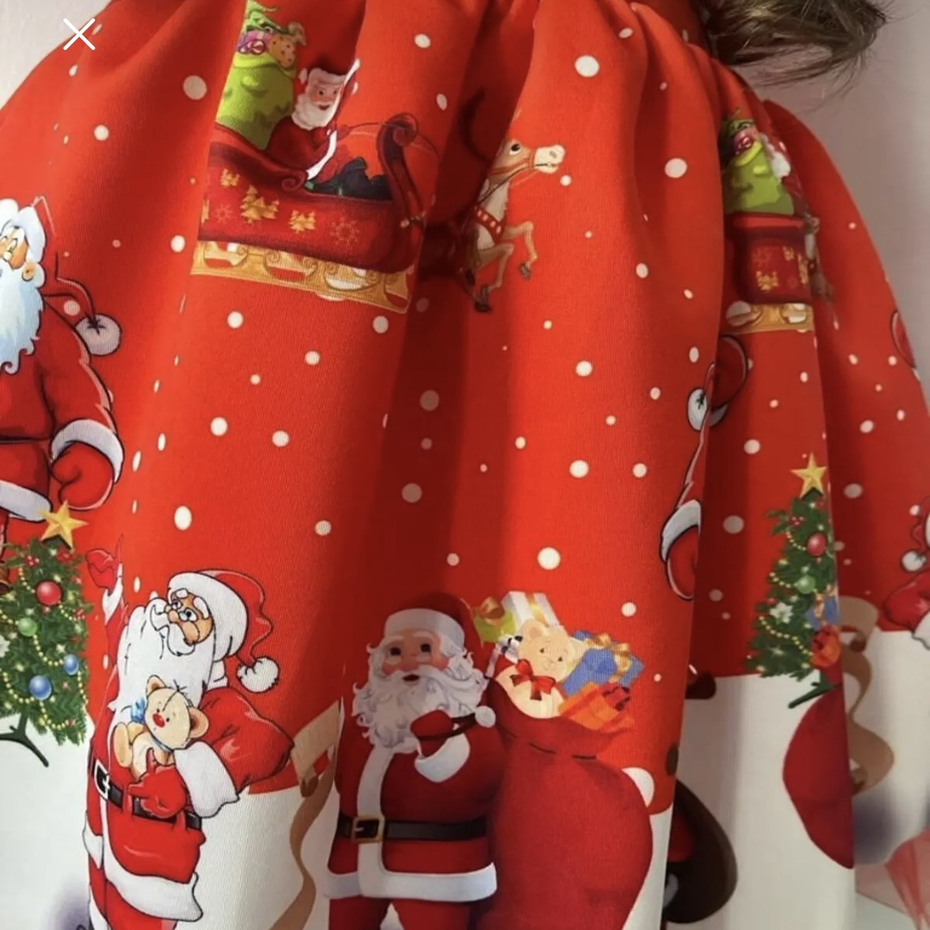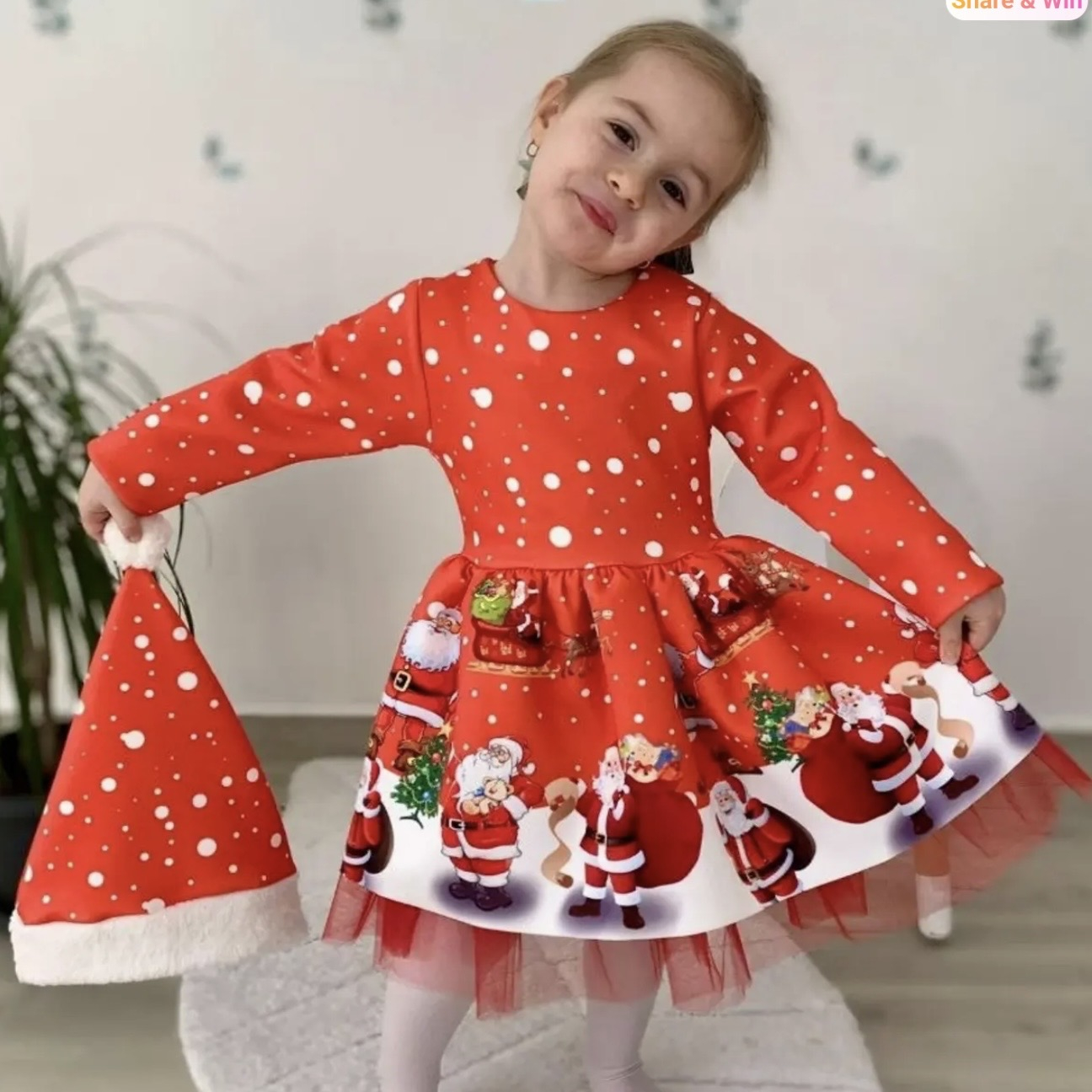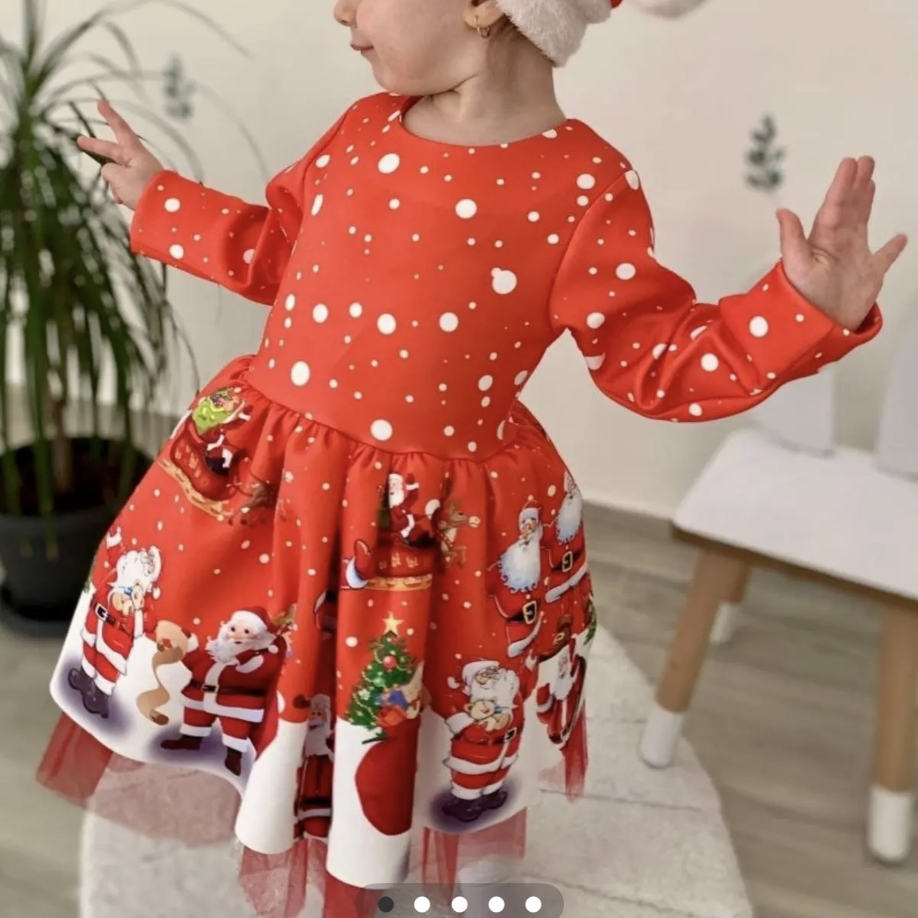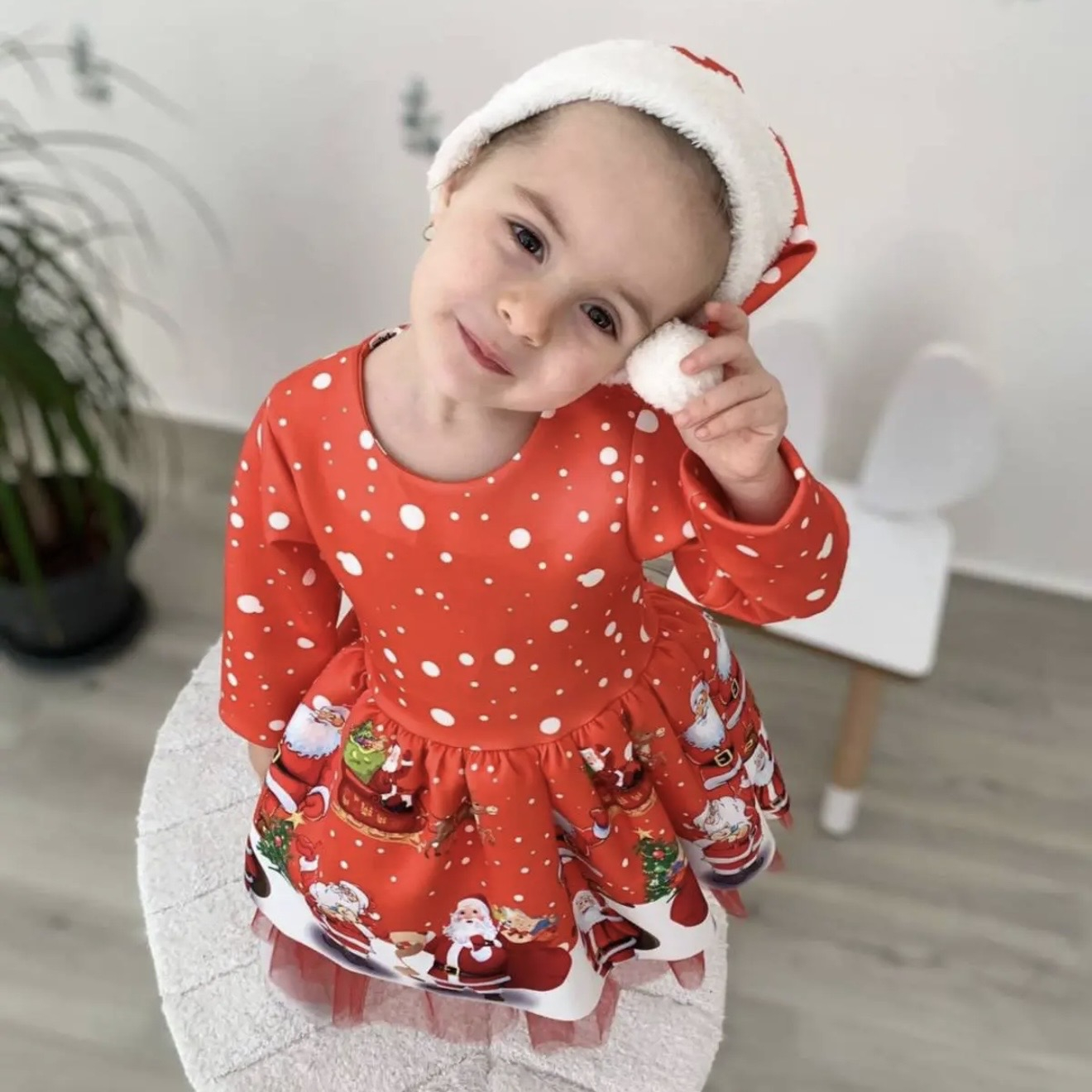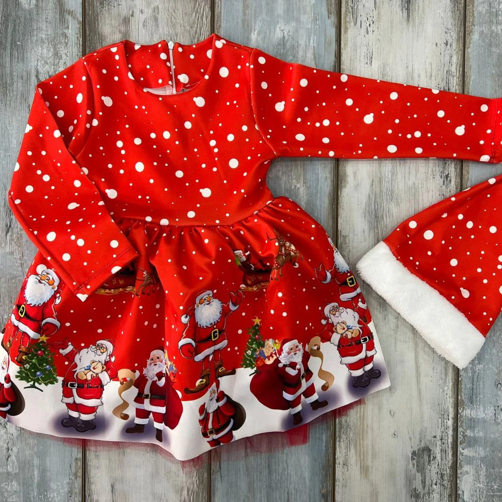Rochiță roșie de Crăciun cu Moș Crăciun + căciuliță din pluș, realizată din material elastic și confortabil, cu fustiță evazată și tulle moale pentru volum delicat. Perfectă pentru serbări, ședințe foto și cadouri de sărbători.
