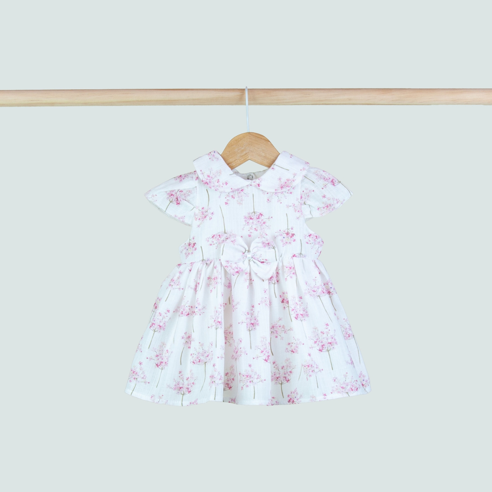 Confecționată dintr-o țesătură albă moale, rochița este presărată cu un imprimeu floral delicat, în nuanțe pastel de roz și verde. Gulerul rotund tip “Peter Pan” adaugă un aer elegant, iar mânecile scurte cu tăietură lejeră sunt perfecte pentru zilele călduroase.