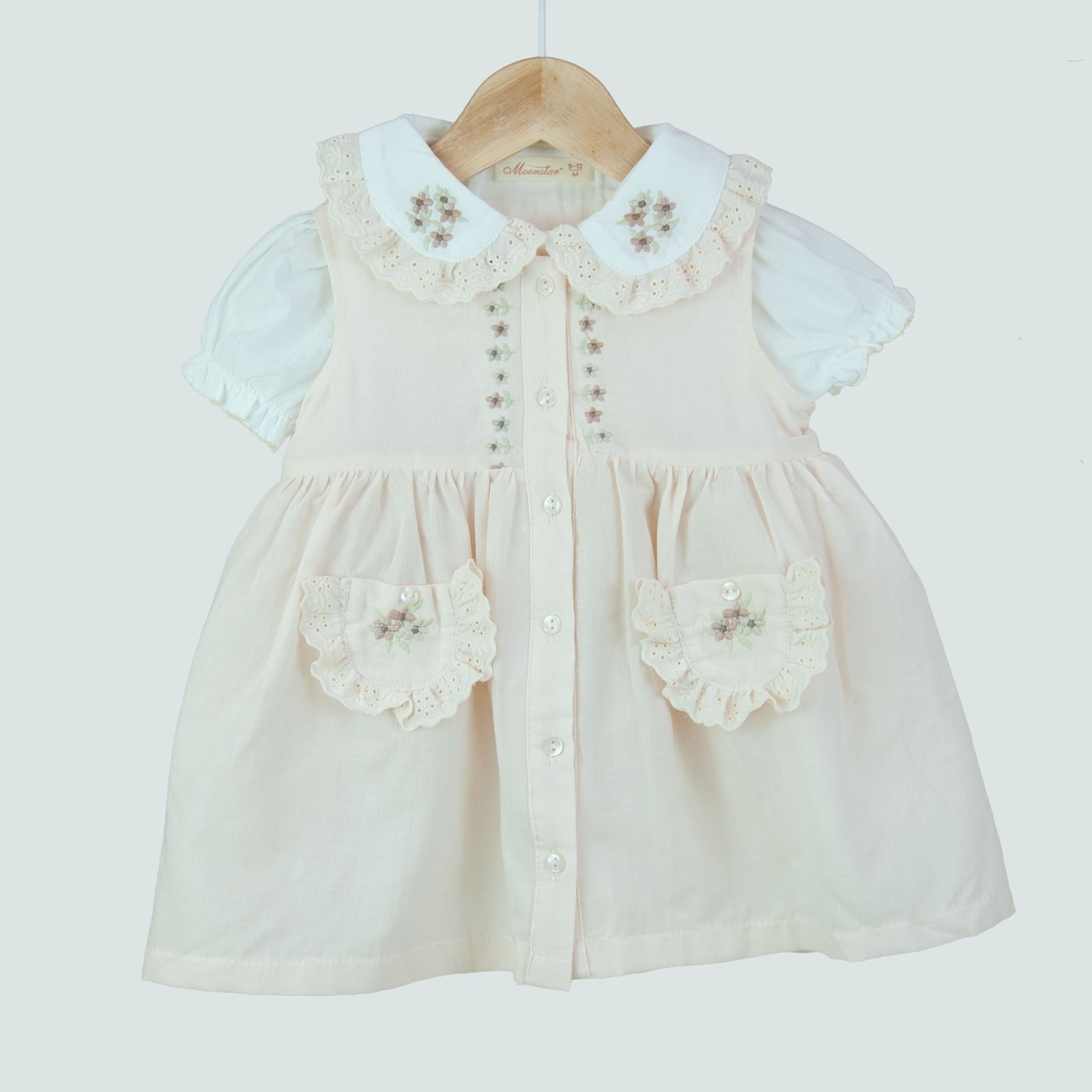 Piesa centrală a setului este sarafanul din bumbac 100%, într-o nuanță bej pastelată, plăcută și calmă. Are un croi lejer, cu falduri ușoare și închidere cu nasturi perlați în față. Gulerul tip Peter Pan este parte din sarafan și este decorat cu broderii florale fine și dantelă delicată, adăugând un aer romantic și vintage. Cele două buzunare frontale sunt accentuate cu volănașe și flori brodate, pentru un plus de farmec.