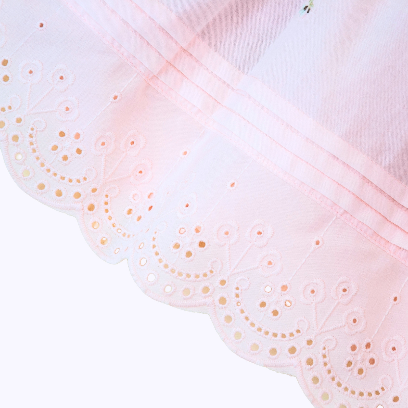 Rochița este realizată din bumbac moale, delicat la atingere, într-o nuanță gingașă de roz pal. Are mânecuțe bufante cu volănașe fine, iar gulerul rotund, brodat cu perforații florale, adaugă un farmec vintage irezistibil. Bustul este decorat cu pliuri verticale, perle delicate și o fundiță laterală elegantă, ce subliniază atenția la detalii.