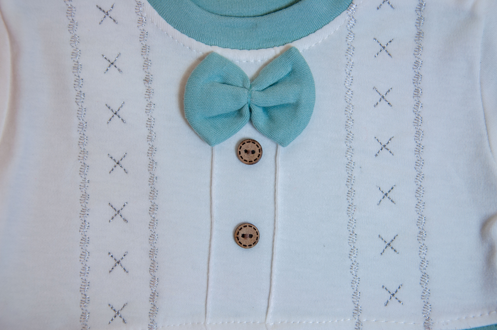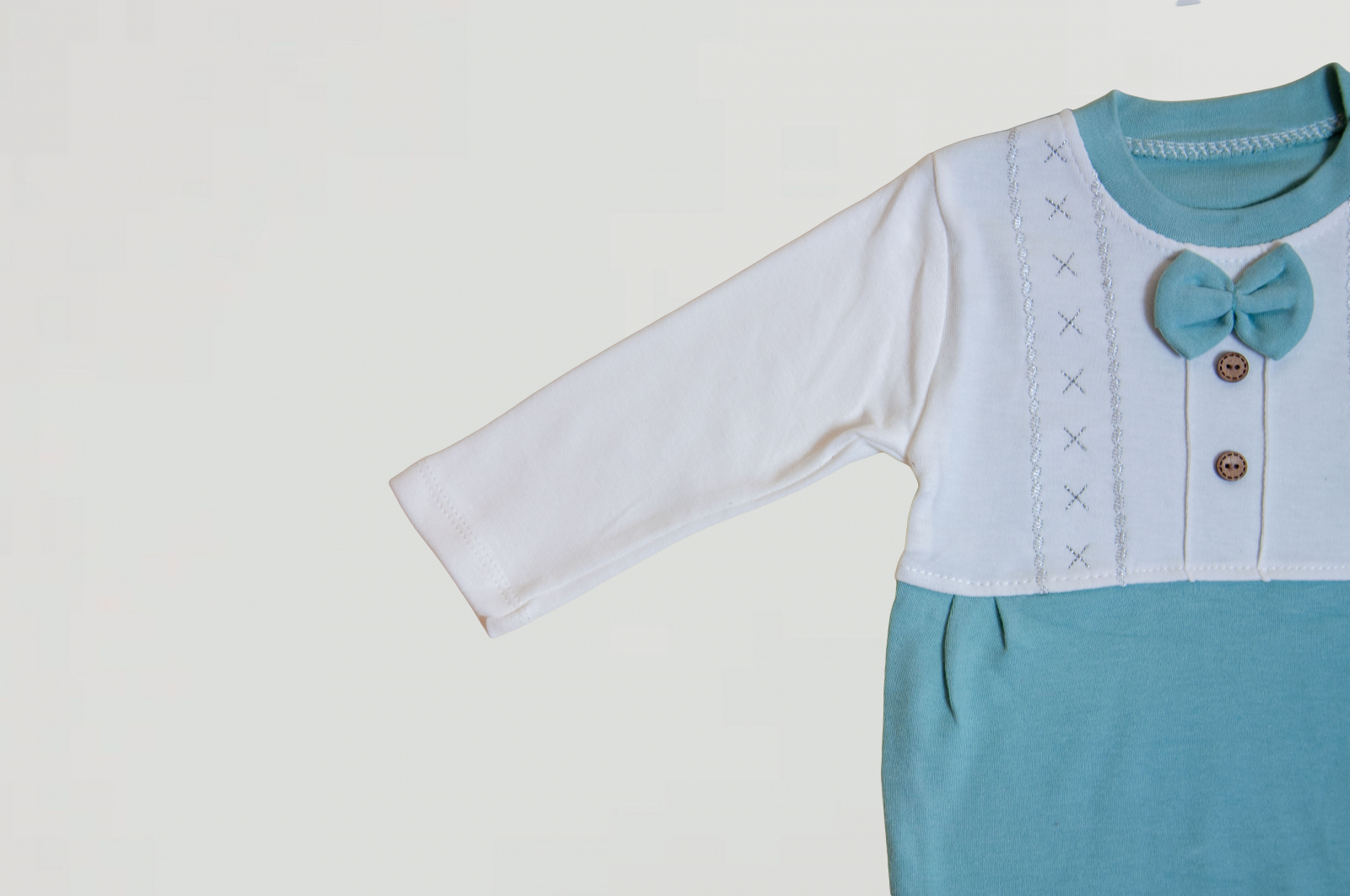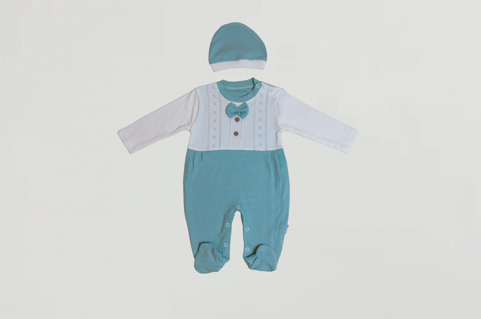 Un set adorabil pentru ocazii speciale, botez sau ședințe foto! Salopeta în două tonuri – alb și verde – este completată de un papion aplicat și nasturi decorativi, oferind un aspect “mini-gentleman”.