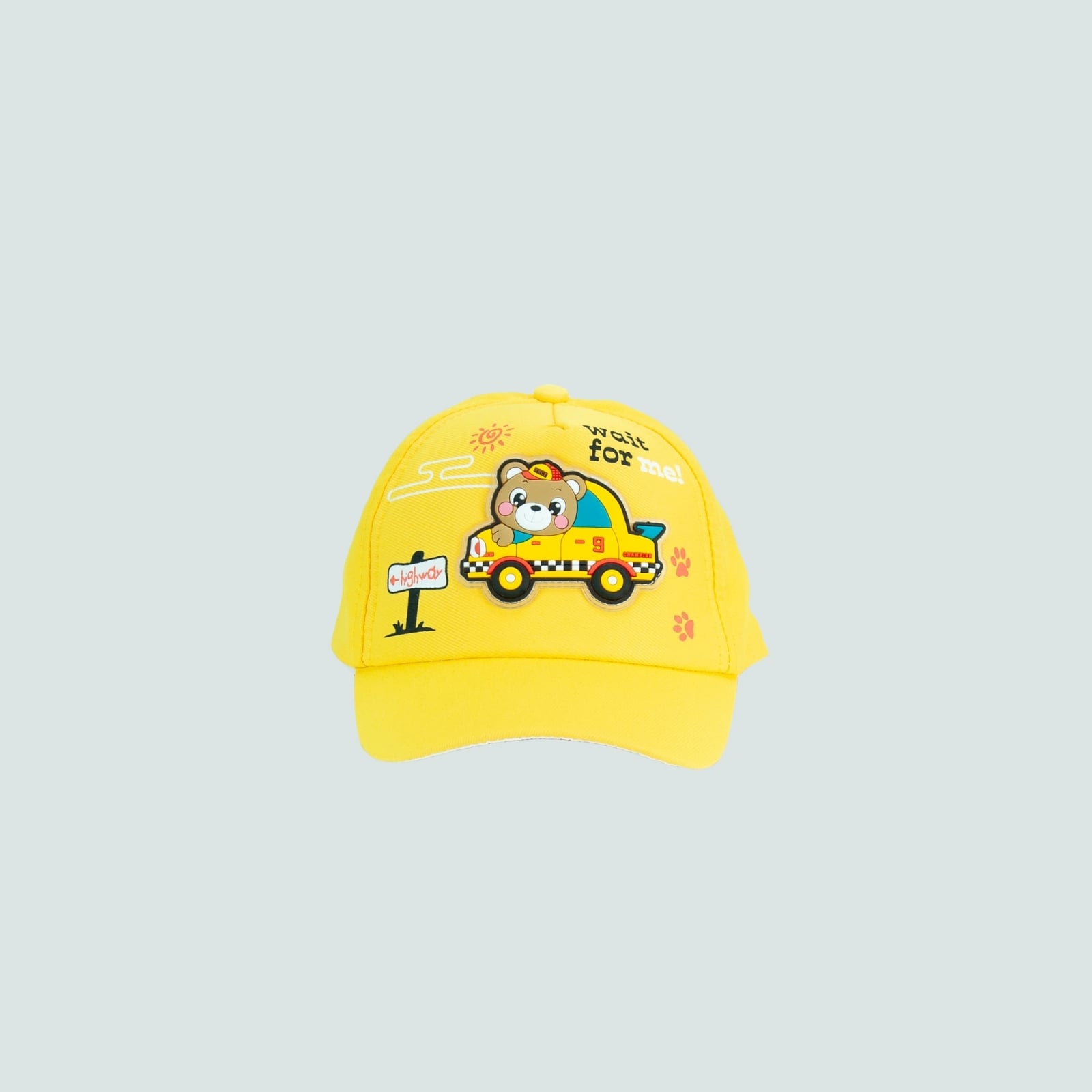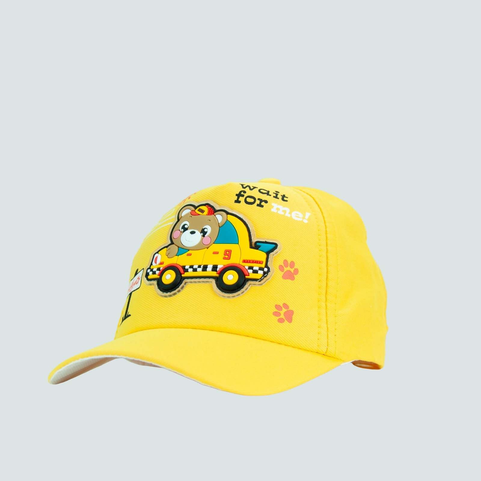 Un accesoriu vesel și practic pentru micuțul tău! Această șapcă adorabilă, în nuanță vibrantă de galben, este decorată cu un ursuleț simpatic într-o mașinuță de taxi, gata de aventuri. Textul „Wait for me!” adaugă un strop de umor, iar urmele de lăbuțe dau un aer jucăuș și plin de personalitate.