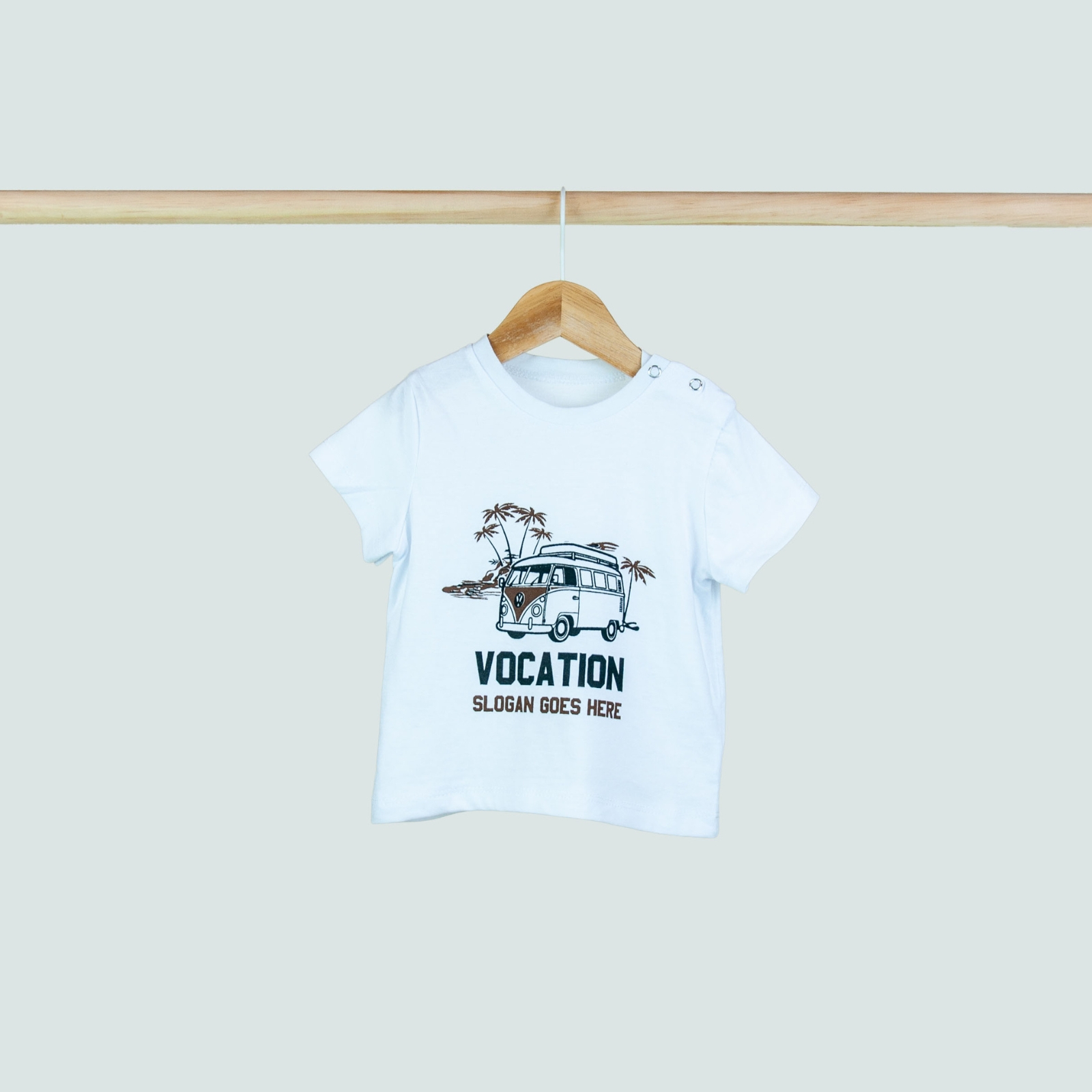Un tricou simplu, din bumbac moale și aerisit, ideal pentru purtare zilnică. Imprimeul din zona pieptului este în ton cu tema setului, sugerând vacanțe, mașinuțe și voie bună. Se poate purta atât singur, cât și sub cămașă sau jachetă.