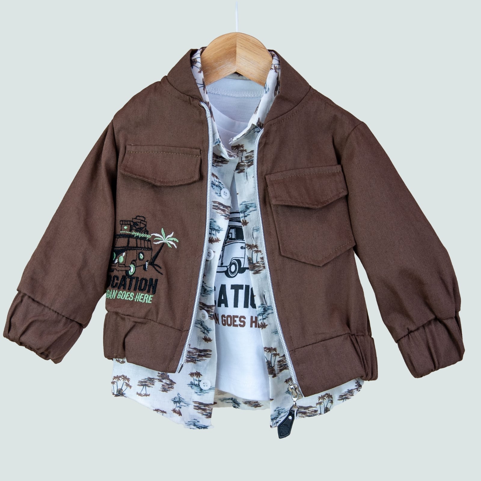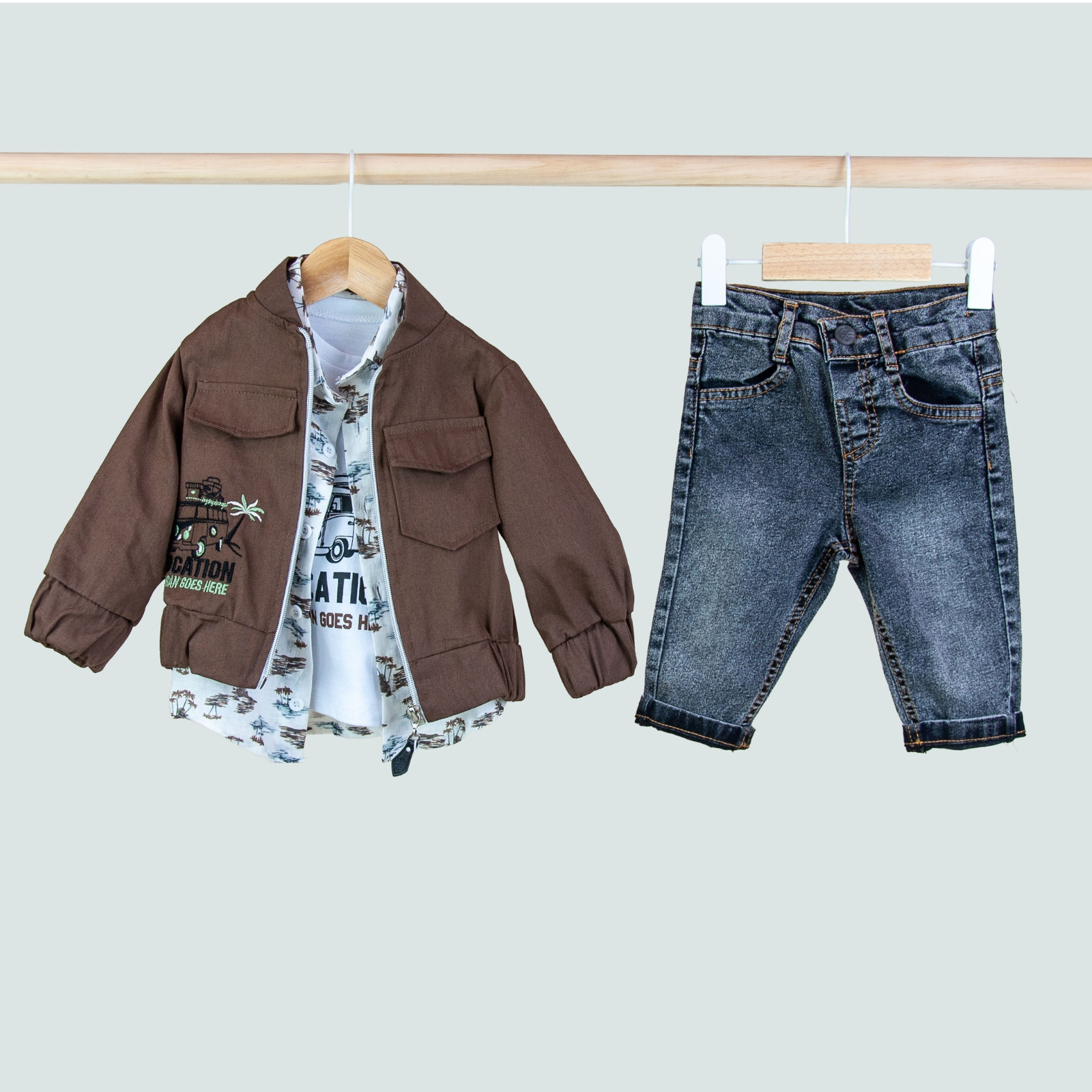 Un set modern și versatil, perfect pentru micii aventurieri care adoră să exploreze lumea cu stil! Format din jachetă, cămașă imprimată, tricou și pantaloni tip jeans, acest outfit este potrivit atât pentru plimbări, cât și pentru momente speciale în familie.