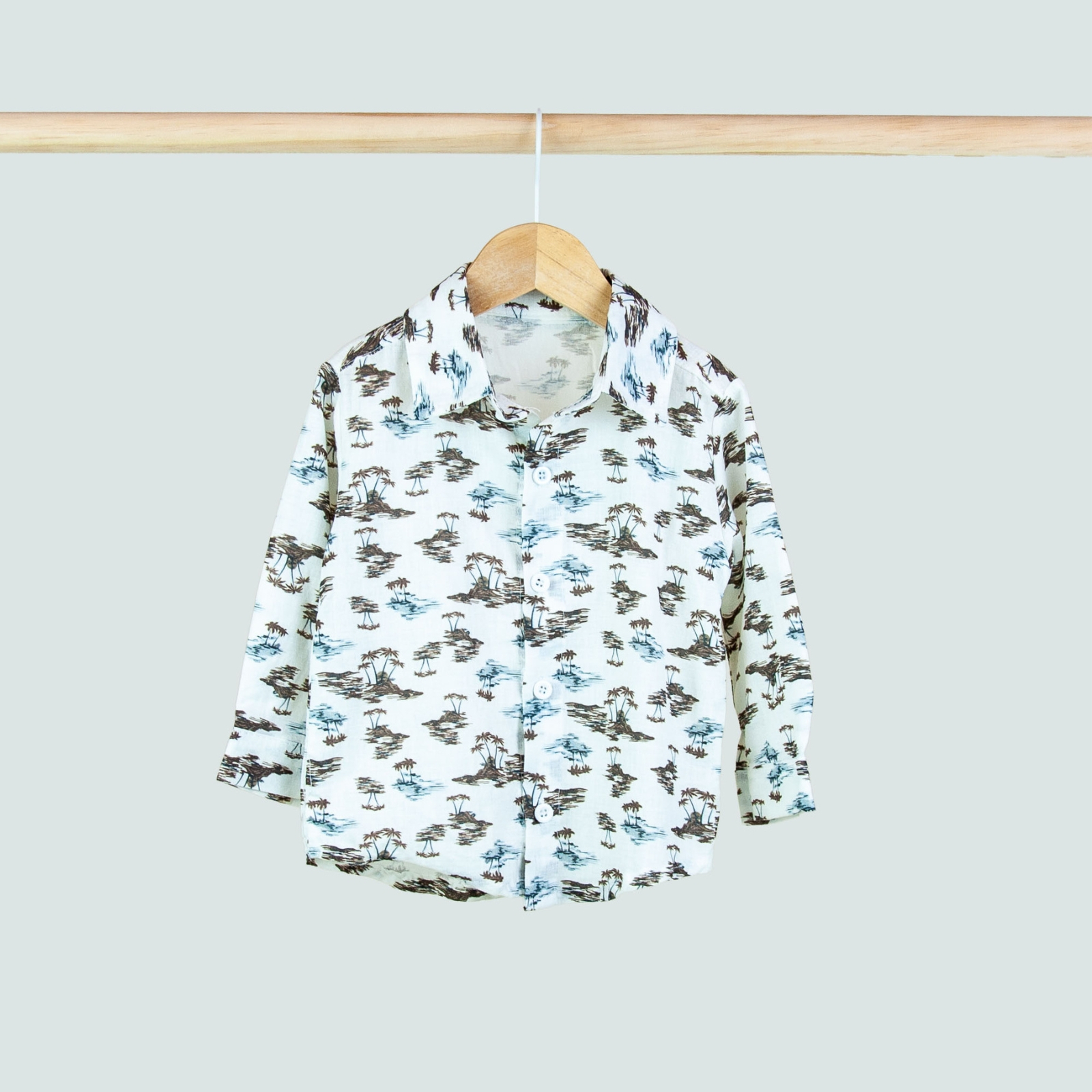 Realizată dintr-un material ușor și fin, cămașa are imprimeuri cu mașinuțe și palmieri – elemente care sugerează vacanța perfectă. Închidere clasică cu nasturi, poate fi purtată deschisă, peste tricou, pentru un look casual stratificat.