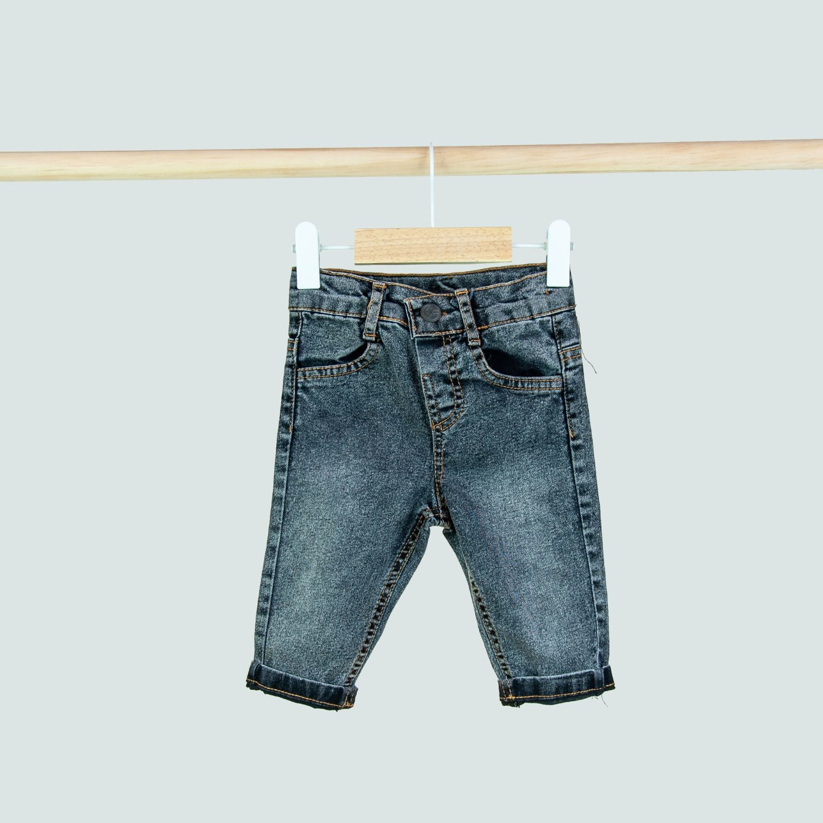 Jeans-ii de culoare gri inchis sunt confecționați dintr-un amestec de bumbac și elastan, oferind libertate de mișcare și un aspect modern. Talia este ajustabilă, iar materialul este plăcut la atingere, ideal pentru pielea sensibilă a copiilor.