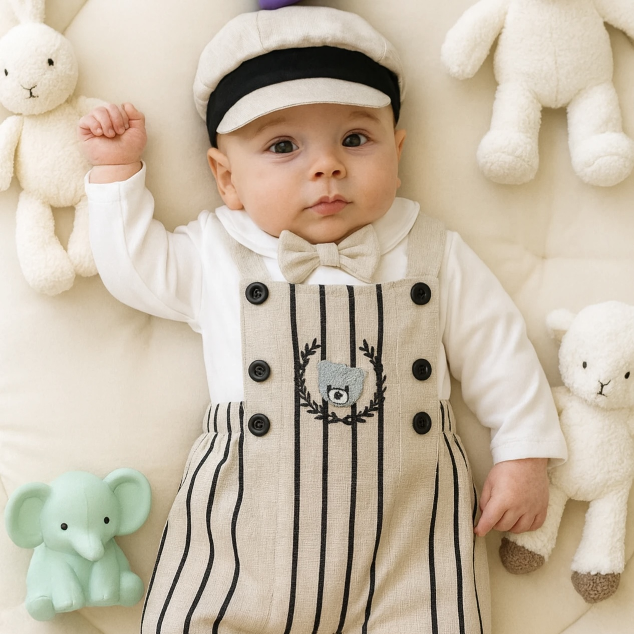Set elegant pentru bebeluși, realizat din materiale moi și confortabile, ideal pentru pielea sensibilă. Setul este compus din cămașă tip body cu guler, salopetă cu bretele și nasturi și șapcă asortată, într-un design rafinat, cu dungi fine și detalii atent lucrate.