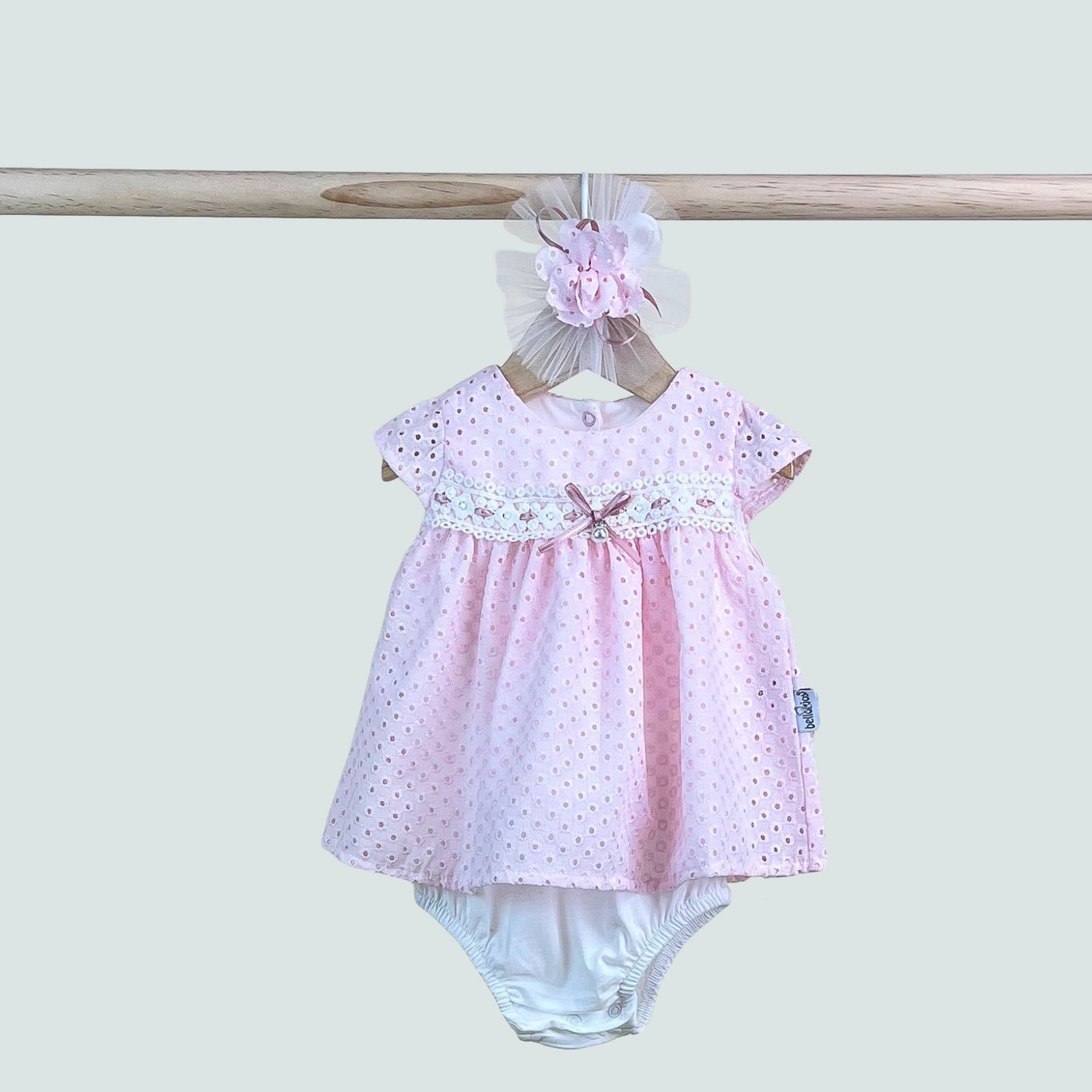 🌷 Rochița roz pudrat este confecționată din bumbac brodat tip „broderie anglais”, un material ușor și respirabil, ideal pentru zilele calde. Croiala lejeră, mânecuțele scurte și dantela fină de la piept, completată cu o fundiță satinată și perlă, oferă un aer elegant și romantic.
