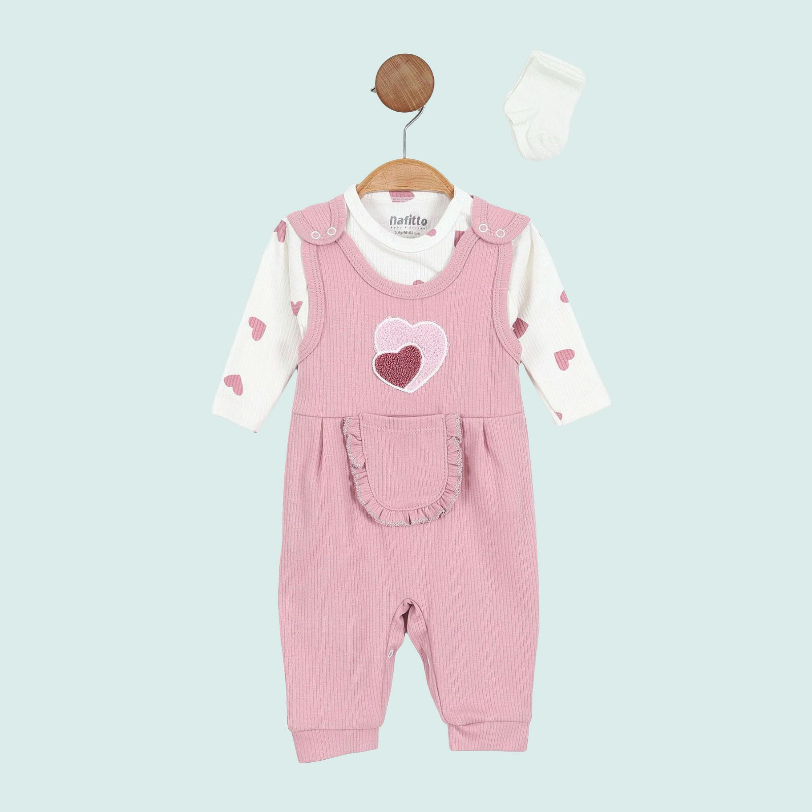 ✔️ Salopetă delicată – realizată din bumbac fin ripsat, într-o nuanță caldă de roz pastel. Este decorată cu două inimioare brodate aplicate pe piept și un buzunărel cu volănașe în față, adăugând un aer dulce și elegant.