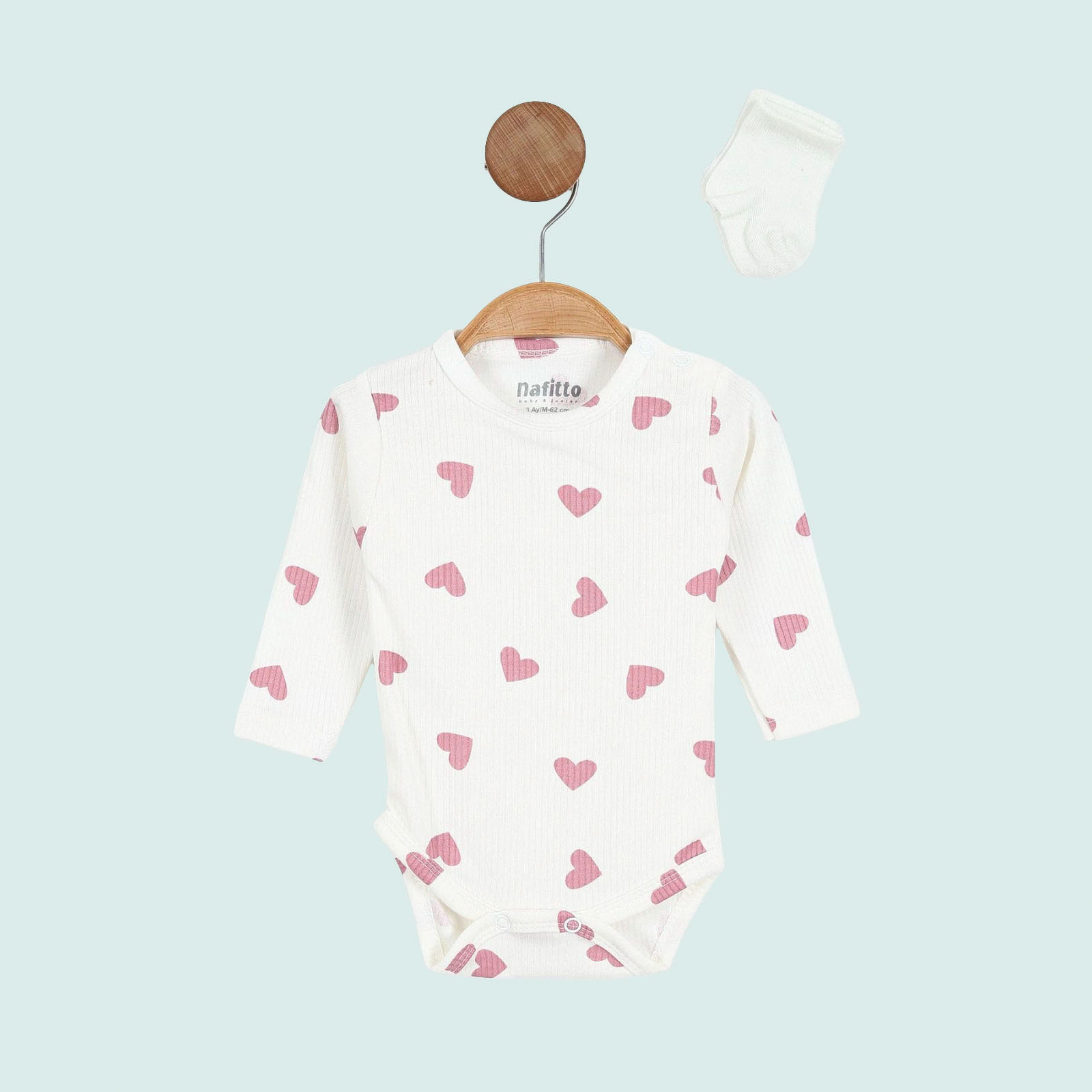 ✔️ Body cu inimioare – alb, cu mâneci lungi și imprimeu vesel în formă de inimioare roz, ce completează perfect salopeta.