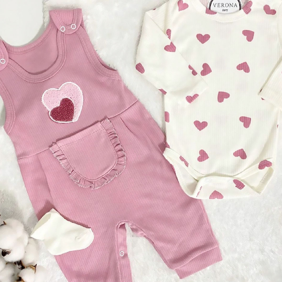 ✨ Set pentru Fetițe – Salopetă Roz cu Inimioare și Body Asortat ✨