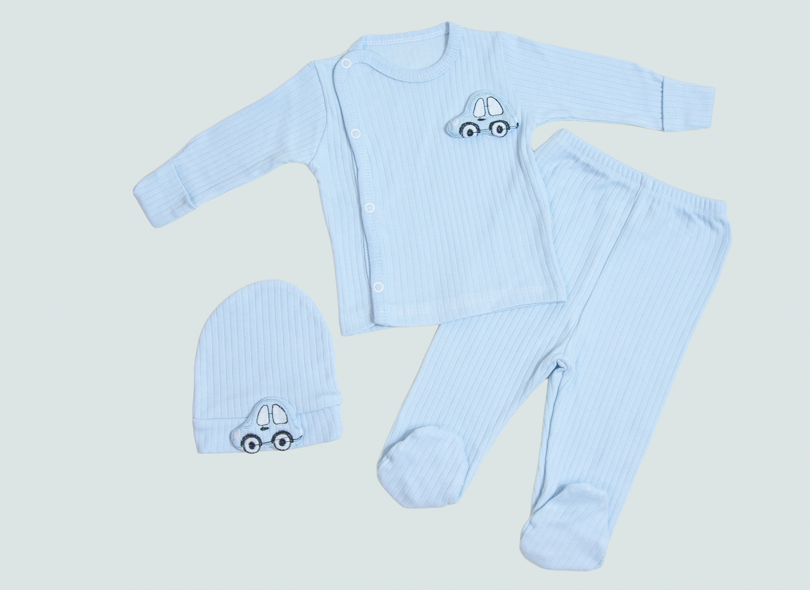 Acest set adorabil conține bluză cu capse, pantaloni cu botoșei și căciuliță, toate într-o nuanță calmantă de albastru. Broderia cu mașinuță adaugă o notă jucăușă și simpatică.